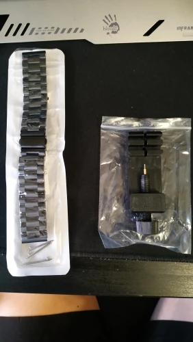 хороший браслет, увесистый, в комплекте устройство для съема звеньев, с внутренней стороны браслета изображены стрелки, которые показывают какие звенья можно снять и в каком направлении вытаскивать спицы. так же запасная спица для крепления ремешка к часам. нормально упаковано, в целом доволен, после силиконового браслета часы конечно тяжелее на руках стали