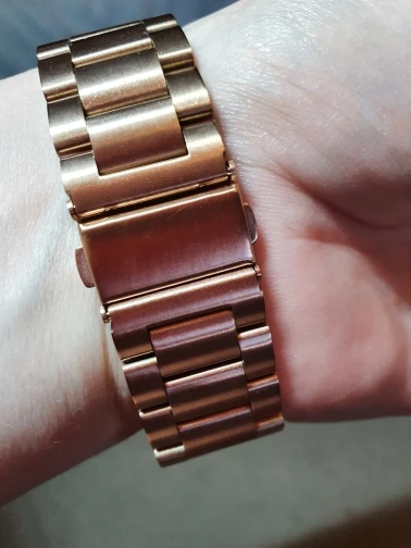 Отличный браслет для часов. Удобно и быстро можно поставить и снять. Размер предусматривает даже мою худую руку, так что если вы худой, можете брать без сомнений. Насчёт приспособления для удаления звеньев, сделано оно из совсем не качественных материалов. Пластик ещё более менее, но металлический штырь, которым нужно выбивать звенья, из очень мягкого металла и легко может погнуться. Но при этом у меня все равно получилось выбить звенья. Браслет отличный, краска за месяц использования не стерлась, главное по острым металлическим кромкам не водить, тогда краска продержится долго. Рекомендую товар