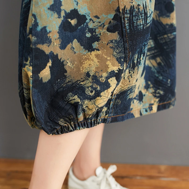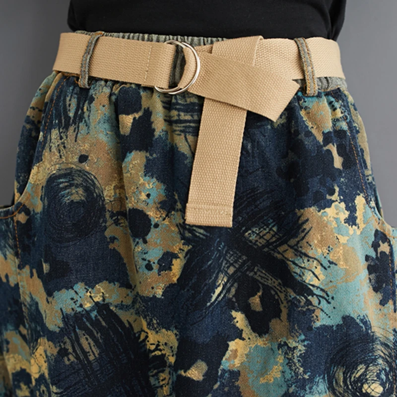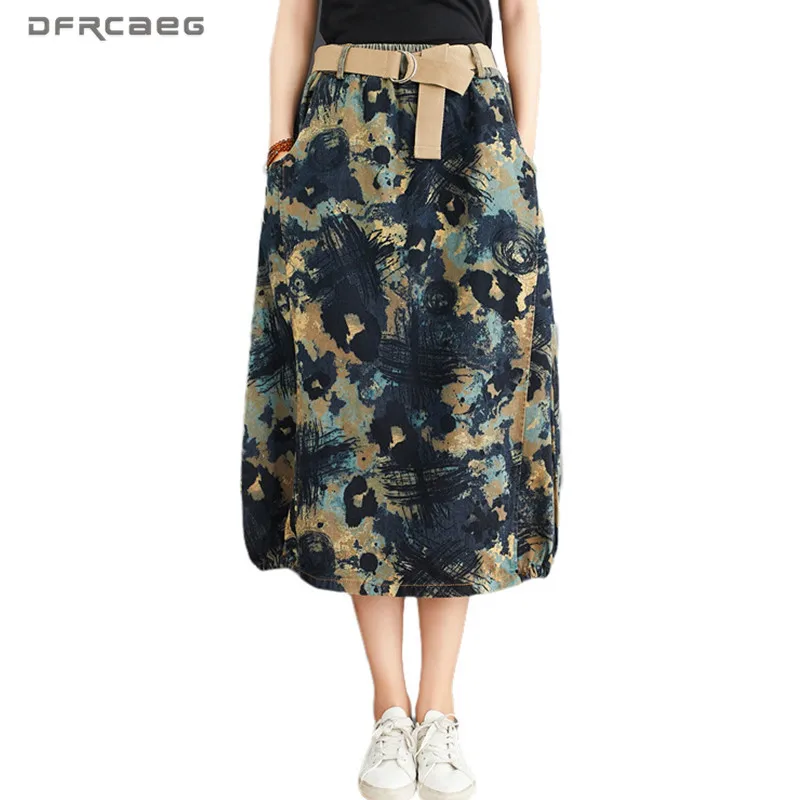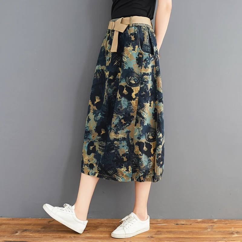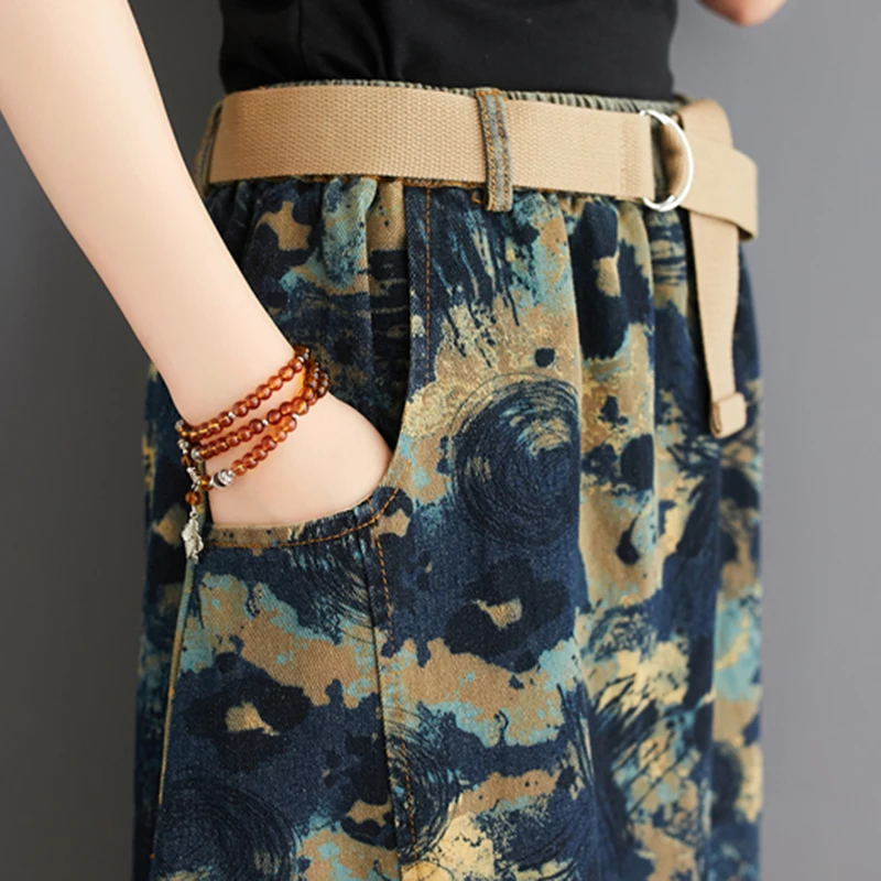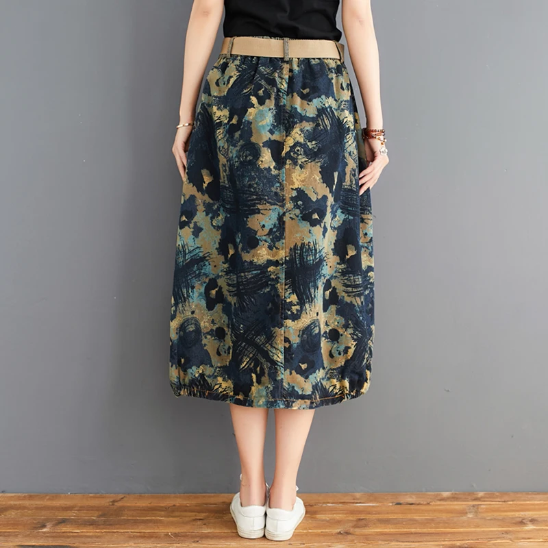 Юбка женская джинсовая с поясом, длинная винтажная уличная одежда с принтом, с эластичным поясом, из денима, трапециевидная в этническом стиле, лето 2020