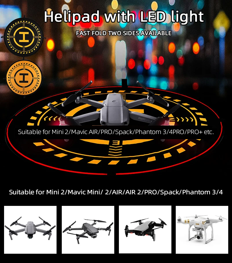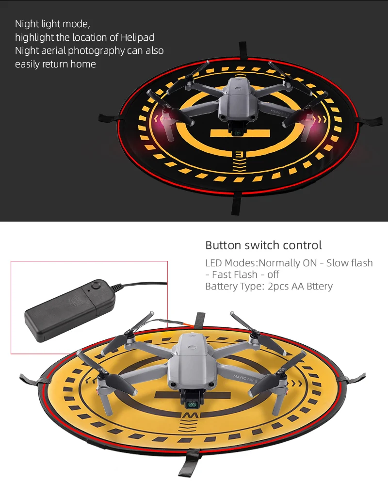 Характеристика:1. Двусторонний дизайн двух цветов, высокоточная печать, наружные чернила, не легко выцветают,2. Положительное и отрицательное использование, вы можете использовать светильник с обеих сторон,3. Специальная сумка для переноски, легко носить с собой,4. Светильник полосы управляется с помощью кнопки переключения, а также светильник режим: always on-медленное мигание-Быстрое мигание взлетно-посадочной используются 2 батарейки типа АА).Описание:Материал: ткань,Применимые модели: для Mavic 3 /Mavic / 2/Mavic Pro / Mavic Air 2/Mavic Air/ Mavic mini /Mini 2 / Spark / Phantom 3/ Phantom 4,Цвет: черный,Вес нетто: 339 г,Вес посылка: 359 г,Размер изделия: 75 см,Посылка: 29,5*29,5 см,Упаковочный лист:1 шт. вертолетная площадка,1 шт. сумка для хранения,1 шт. Ночной светильник,1 шт. переключатель управления,8 шт. Светоотражающая полоса,4 шт. фиксированный гвоздь.Примечание:1. Не включает аккумулятор и Дрон,