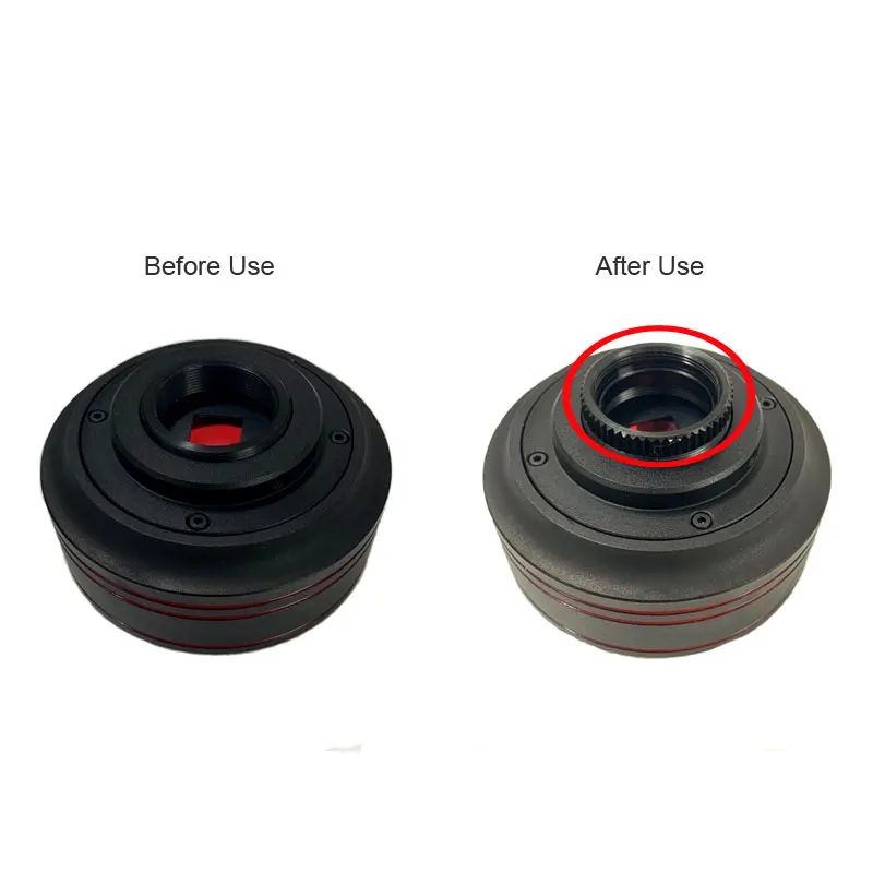 Описанию соответствует, повреждений нет. Внешний диаметр точно соответствует, внутренний примерно 23.3, поэтому на c-mount без резинового колечка незначительно люфтит.