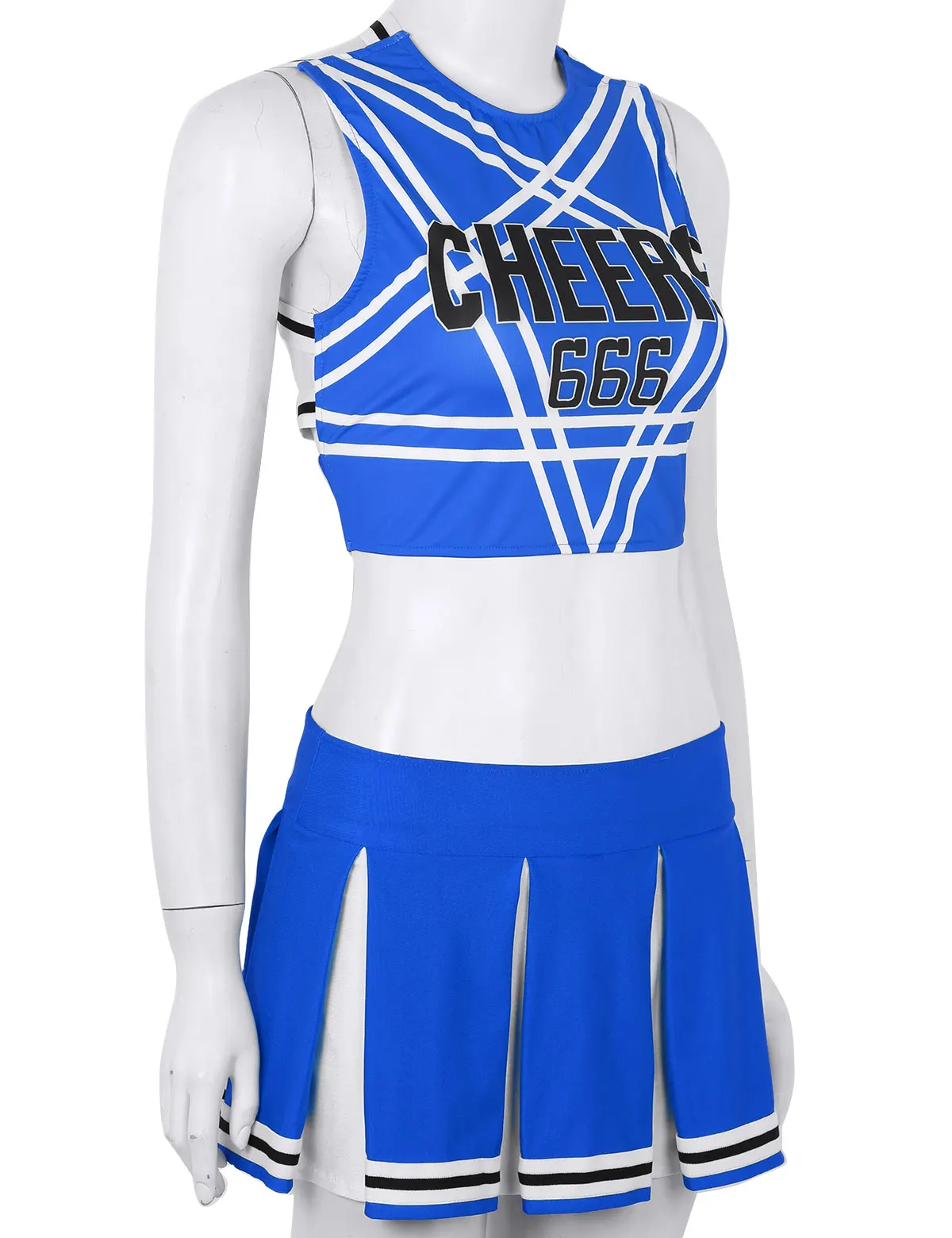 Особенности:Женский костюм болельщика для костюмированной вечеринки; Комплект одежды; Застежка на застежке.Без рукавов и с открытой спиной, с эластичными лямками, с пентаграммой сзади, спереди напечатаны буквы «CHEERS 666».Сочетающаяся мини-плиссированная юбка с эластичным поясом, хорошая эластичная ткань, мягкая и удобная в носке.Хороший выбор для нарядов, ролевых игр, сценических костюмов, карнавала, танцев, соревнований по танцам и т. д.Для получения подробной информации о размерах обратитесь к описанию товара. Ручная стирка в холодной воде.