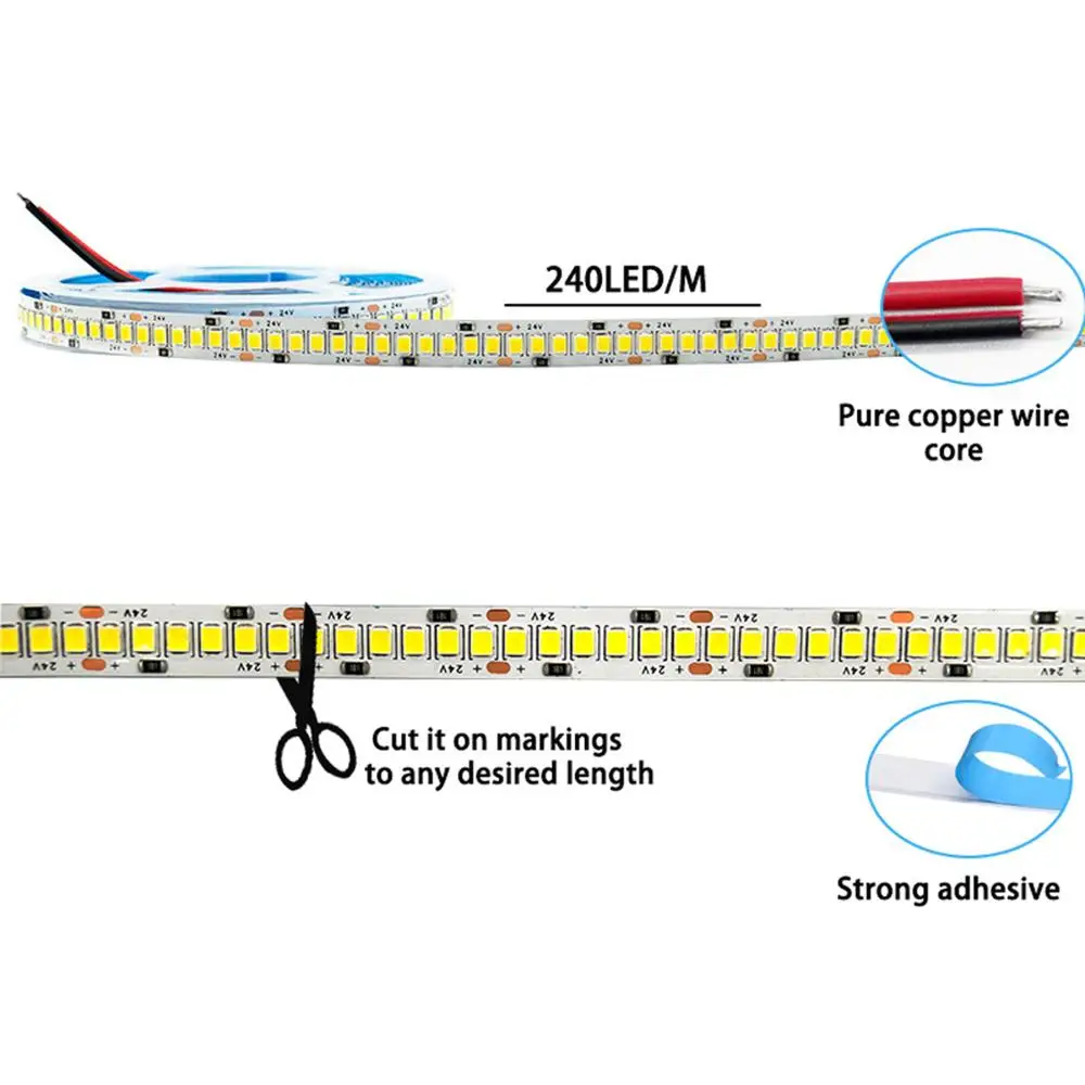 Гибкая светодиодная лента 2835, 240 светодиодовм, 1200SMD, 12 В, 24 В, белая, теплая, белая, синяя, зеленая, красная, желтая, IP20, 5 мрулон