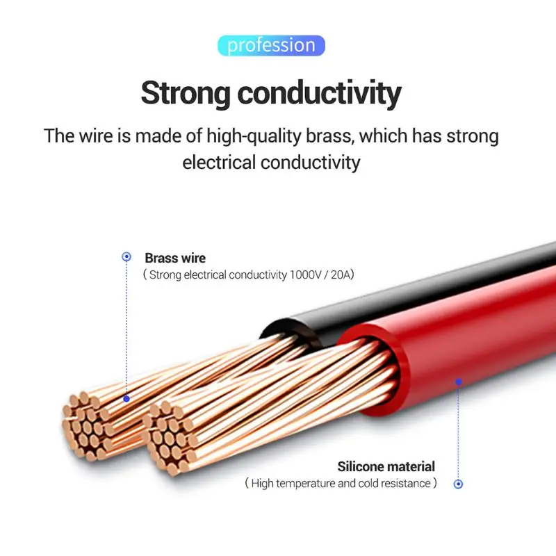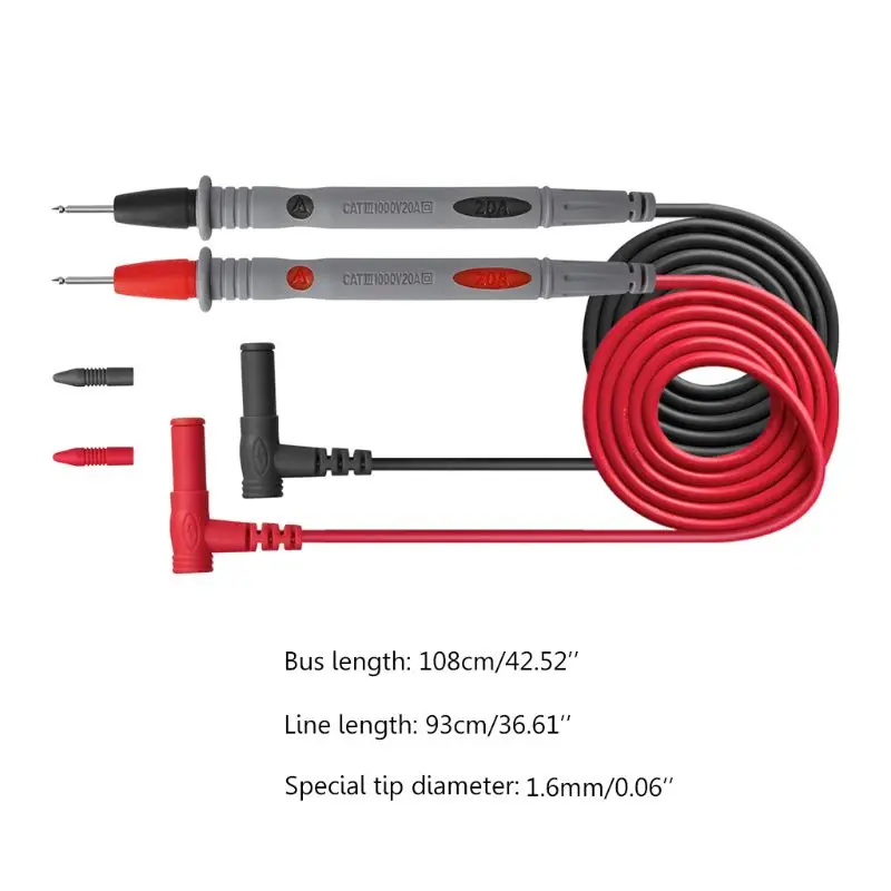 Материал кабеля: силиконовый проводКрасный: ПоложительныйЧерный: отрицательныйДлина кабеля: 88 смОбщая длина: 106 смПрофессиональное испытание Максимальное напряжение: 1000 вУпаковочный лист:1 пара x Универсальный цифровой мультиметр многометровый тест-зонд провод ручка кабель1 пара зажимов типа «крокодил»