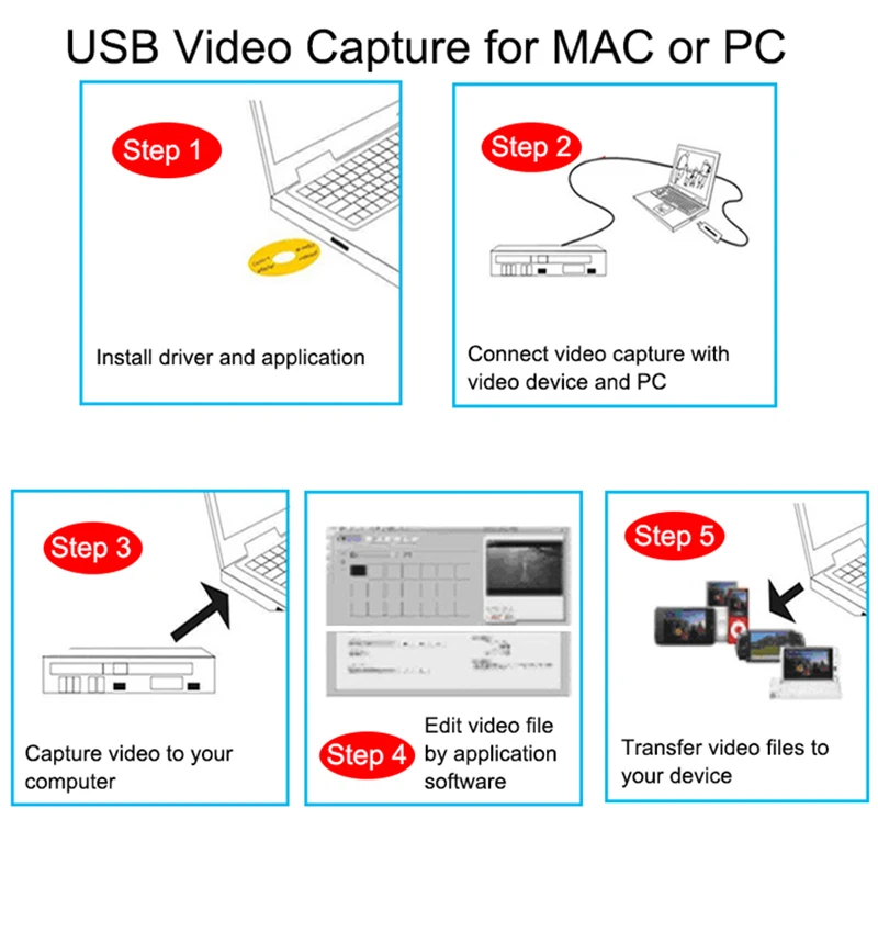 Спасибо за покупку карты видеозаписи ezcap159 USB 2,0, itРаботает как для ОС windows, так и для MAC OS X Для ОС Windows мы предлагаем различное программное обеспечение для использования, если вы выбираете программное обеспечение Showbiz 3,5, некоторые версии win 10 не могут быть совместимы, если вы выбираете программное обеспечение VHSTODVD5.0, все системы windows могут быть совместимы. Различное программное обеспечение имеет различную цену, вы можете выбрать. VHSTODVD является наиболее campatibled на windows в настоящее время. Для MAC OS X вы можете записывать видео непосредственно с помощью проигрывателя QuickTime. Преимущества: 1. Запись аналогового видео от VHS,V8,Hi8, видеокамеры и т. Д. До цифровых. 2. Поддержка Windows (7/8/10) и MAC OS 10,10 или более поздней версии. 3. Поддержка функции снимка Он может записывать высококачественные видео и аудио файлы непосредственно через интерфейс USB 2,0 без звуковой карты. . Поддержка контроля яркости, контрастности, оттенка и насыщенности . Поддержка всех форматов: запись в DVD +/-R/RW, DVD +/-VR и DVD-Video . Применение к Интернет-конференции/сетевому собранию . Соответствует универсальной спецификации последовательной шины Rev. 2,0 . Поддерживает формат NTSC, PAL видео . Видео вход: один композитный RCA, один S-Video . Аудио вход: стерео аудио (RCA) . Питание USB шины . Цвет: серый (Пожалуйста, обратите внимание: это не черный, это серый, на фото трудно взять как серый, но на самом деле это серый :)) . Поддерживает разрешение видео: NTSC: 720x480 @ 30 кадров в секунду PAL: 720x576 @ 25 кадров в секунду Системные требования: . P4 1,7 GHz CPU или выше . 256 Мб оперативной памяти . VGA карта с 32 Мб памяти . Один доступный порт USB 2,0 . Совместимая звуковая карта Windows . Microsoft windows XP/Vista/7/8/10 (32 и 64 бит),MAC OS X 10,10 и более поздние версии Пожалуйста, обратите внимание: 1. Этот продукт специально разработан только для Mac и Windows, не может работать для Linux /Android и т. Д. 2. Нужно установить драйвер, тогда наше устройство может работать более хорошо в вашей системе. 3. Для MAC OS необходимо использовать QUICKTIME Player, Для windows, используйтеShowbiz 3,5 программного обеспечения или VHSTODVD5.0 программного обеспечения, не может использовать другие. Посылка: . 1 x ezcap159 USB 2,0 видео Захват . 1 x Руководство по быстрой установке . CD-диск с программным обеспечением (включает драйверы, программное обеспечение для редактирования и преобразования видео и руководство)-1 шт. Розничная посылка и другие аксессуары отсутствуют