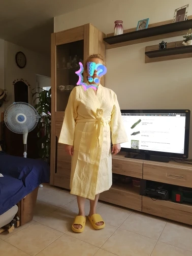 заказала 29.05.21 получила 13.06.21. Качество хорошее, приличный халатик, нн тряпка,похоже на хлопок, но пока не стирала.Мои параметры 152 см, ог 96 см, от 78 см, бедра 96 см, немного так есть животик. По длине мне хорошо, в груди, талии сошелся, но хотелось как-то побольше запахнуться, лучше был бы Л. Возможно заказу побольше, Л.