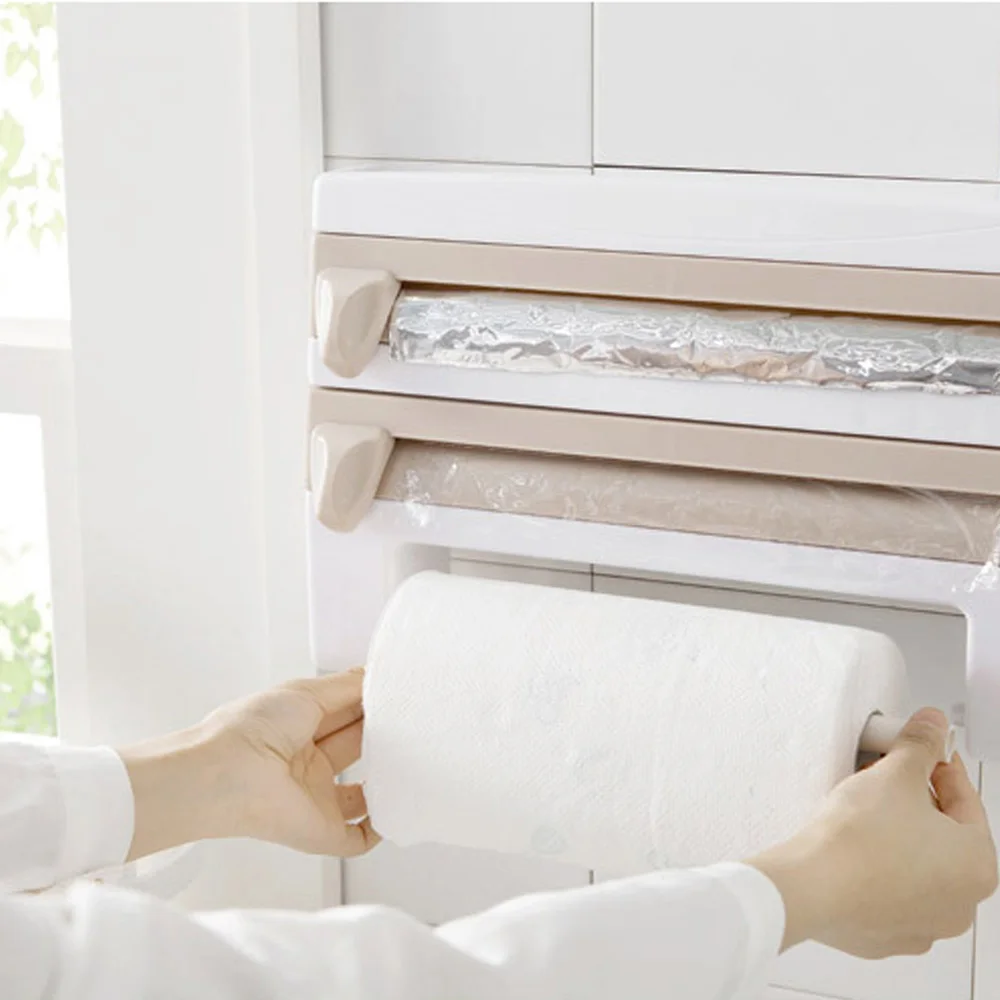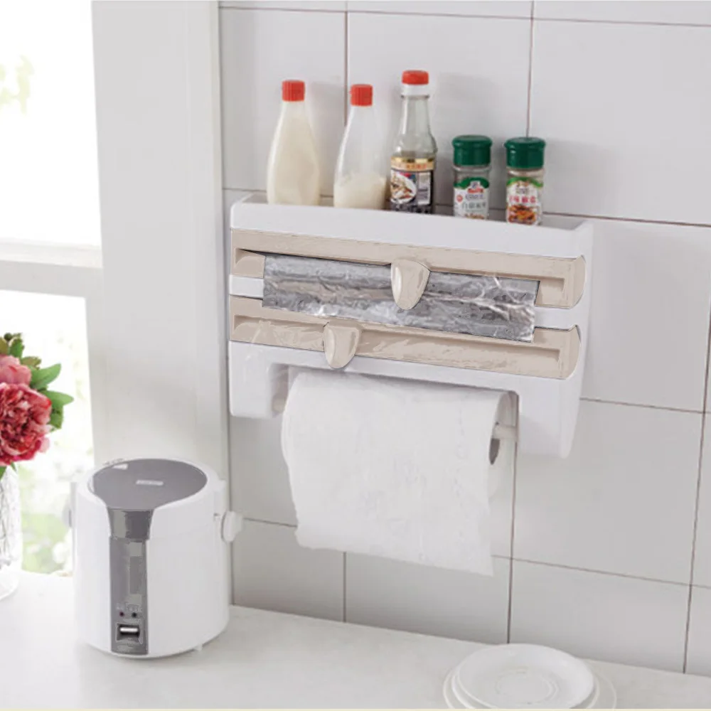Пластиковая Полка для хранения липкой пленки, многофункциональный стеллаж для хранения бутылок соуса, настенный держатель для бумажных полотенец, кухонный Органайзер