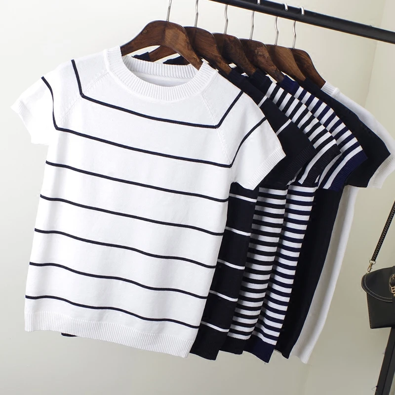 Женский пуловер с коротким рукавом, летний вязаный свитер большого размера в полоску, 2021