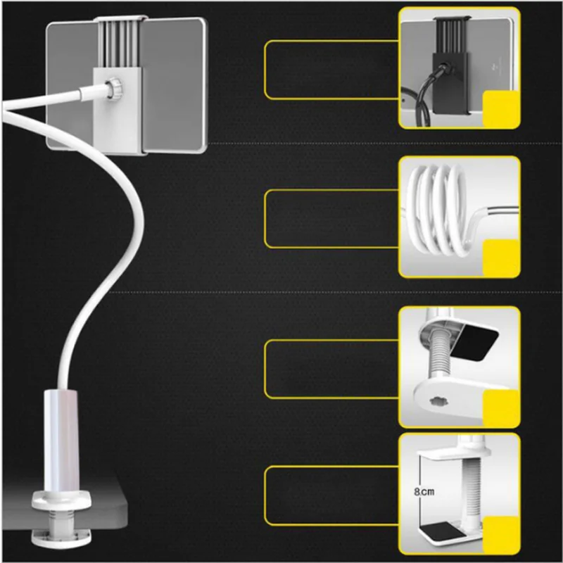 Характеристики: настольный Автомобильный держатель для телефона Lazy bed. Универсальный держатель для Ipad мобильный телефон, MP3, цифровая камера, GPS, камера s и т. Д. Смотреть фильмы/видео, слушать музыку на кровати, не держа свой телефон или планшет! Гибкая рукоятка для разных углов и расстояний. Параметры: труба Материал: ПВХ гибкая трубка Цвет: как показано на картинке трубы Длина: 75 см ширина зажима: 65 мм (может быть растянута до 190 мм) Совместимость со всеми планшет размером от 4-10,6 дюймов