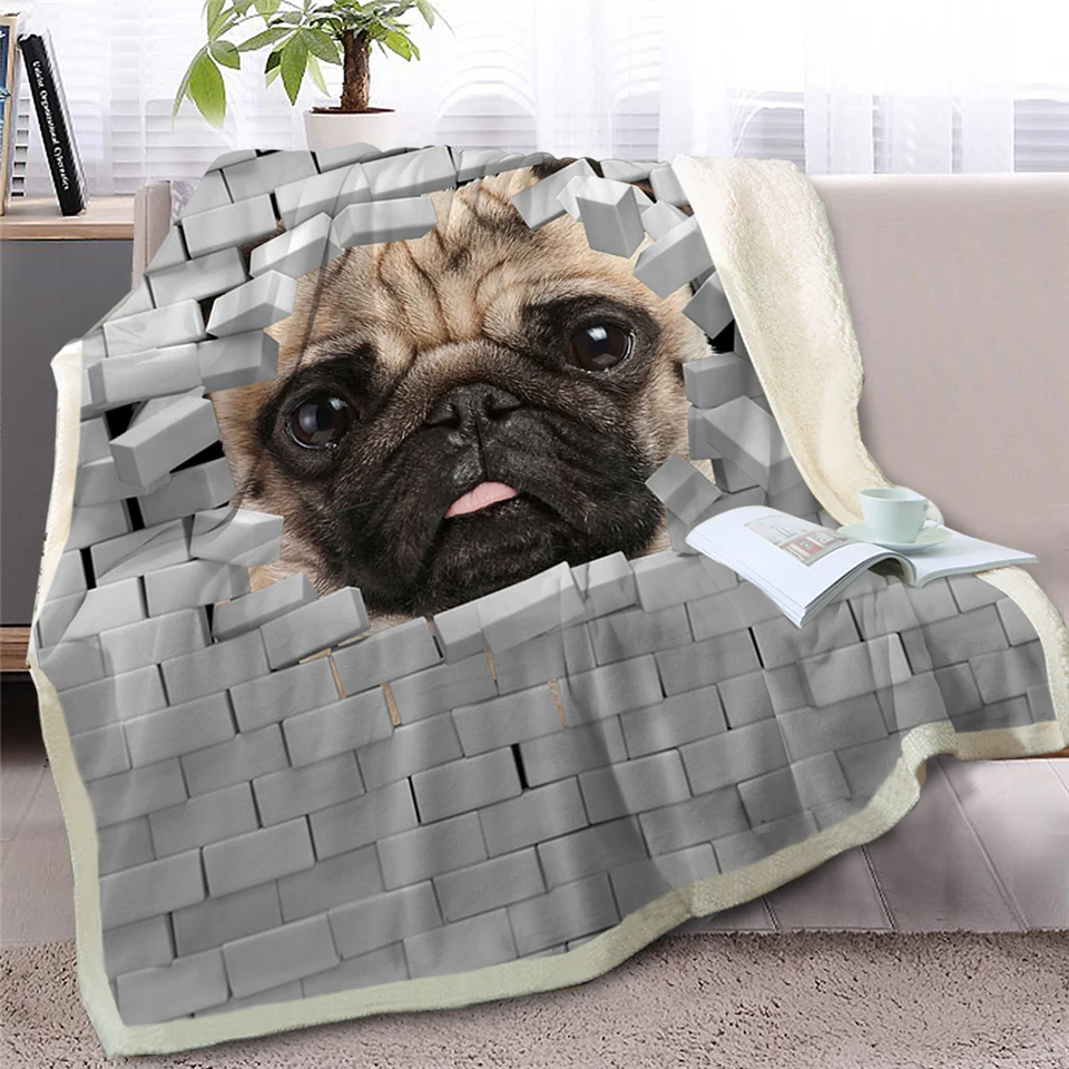 3D одеяло такса на кровать, животное, собака, плюшевое одеяло Sherpa, покрывало бульдог, потрескавшийся кирпич, стена, тонкое одеяло