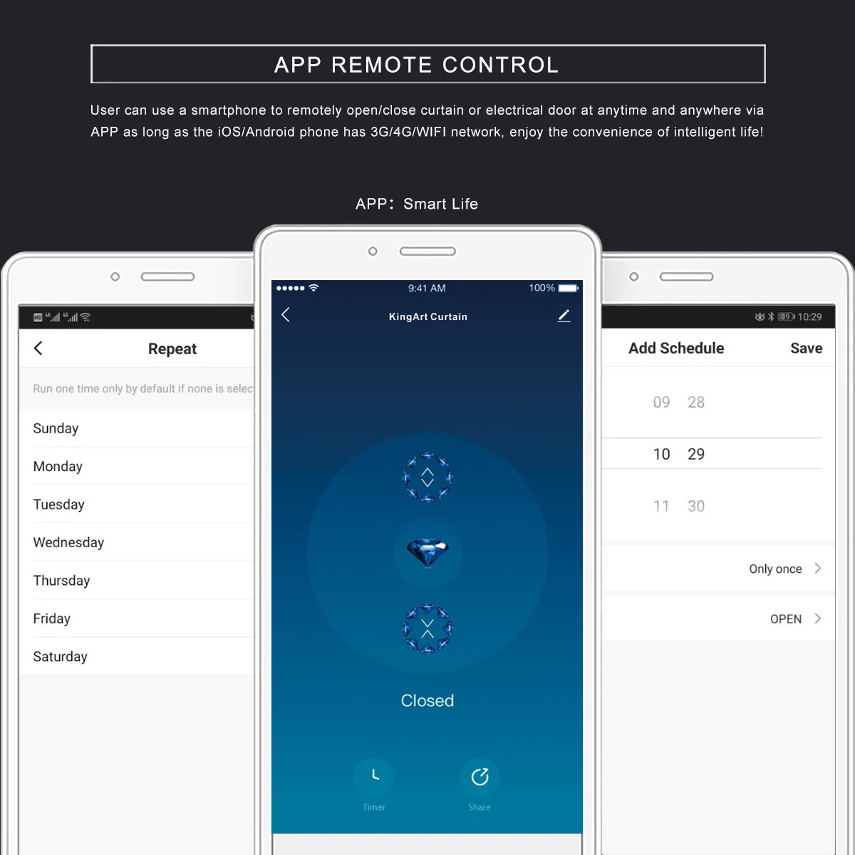 Касание: пауза/открытие/закрытие Удаленный доступ через приложение: пауза/открытие/закрытие Процент открытия/закрытия занавески Расписание/таймеры/Семейный доступ Работает с Amazon Alexa,Google home Сертификация: CE,Rohs,FCC