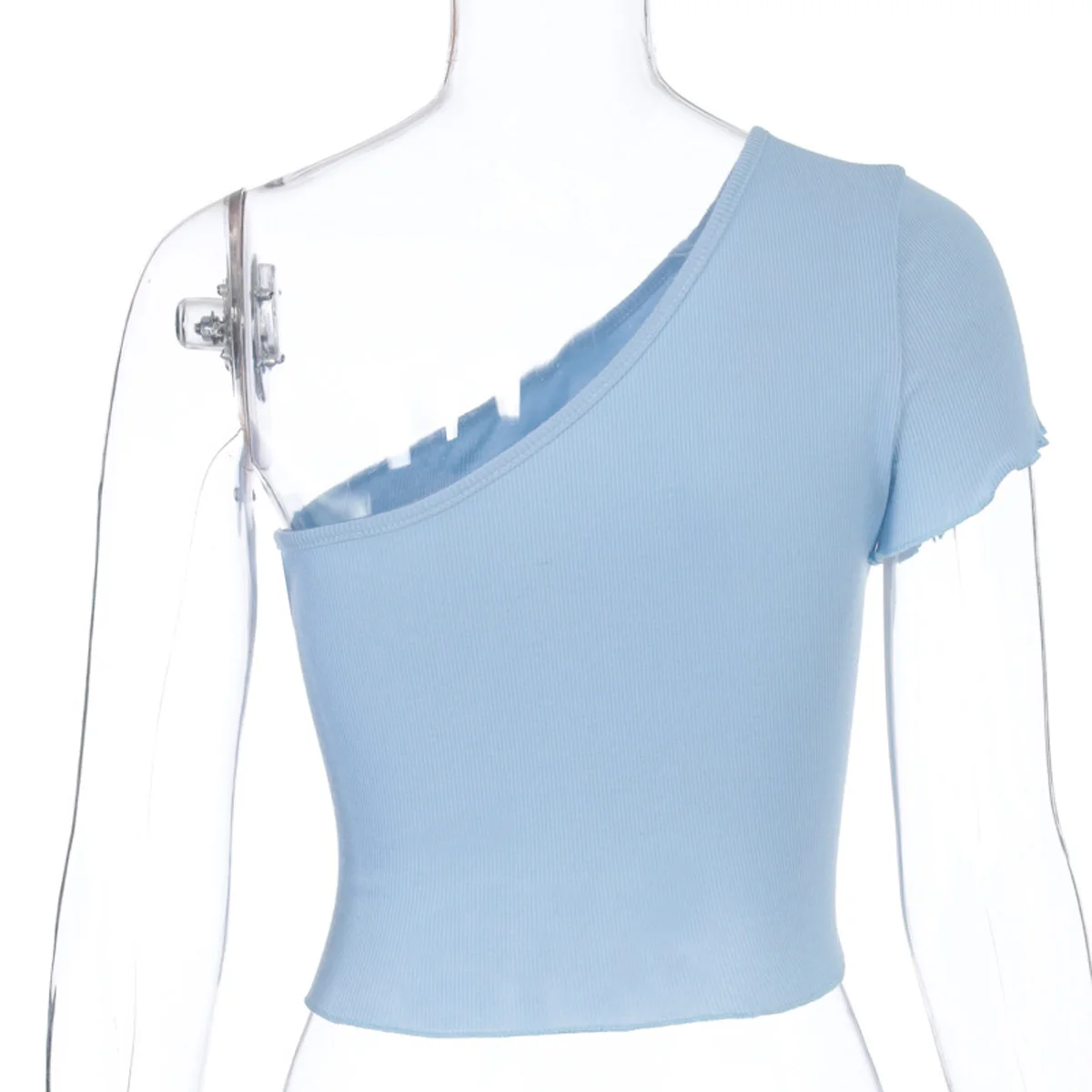 Женская летняя облегающая Однотонная футболка с одним плечом и рюшами, Женская Повседневная футболка с коротким рукавом и открытыми плечами, сексуальный клубный Топ