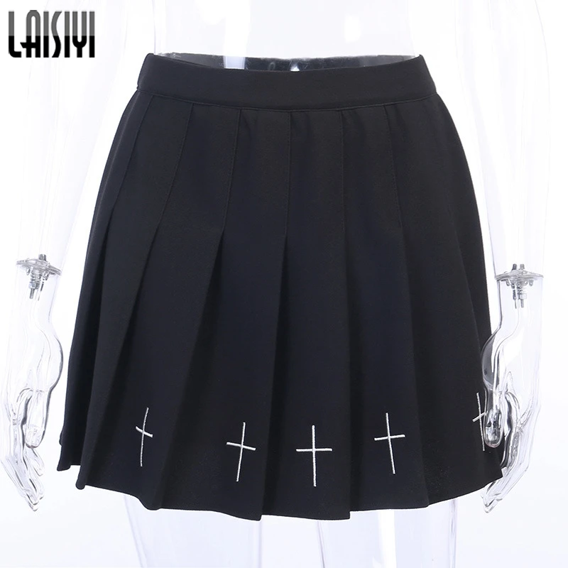 LAISIYI Новинка; Готический стиль; С высокой талией Мини черные юбки в уличном стиле с принтом в виде крестов Женская плиссированная юбка Повседневная колледжа в стиле Лолита в стиле Харадзюку юбка