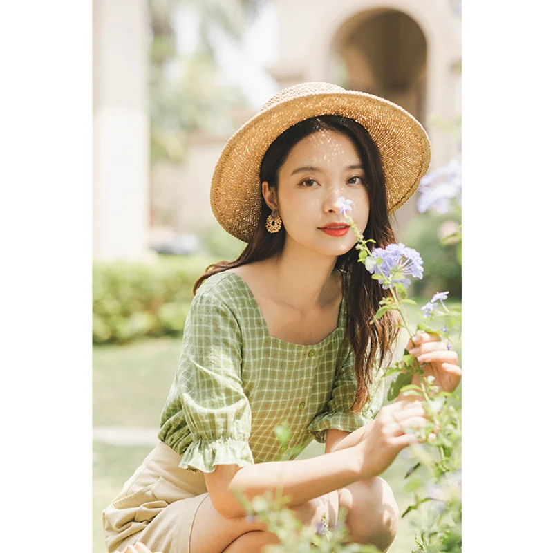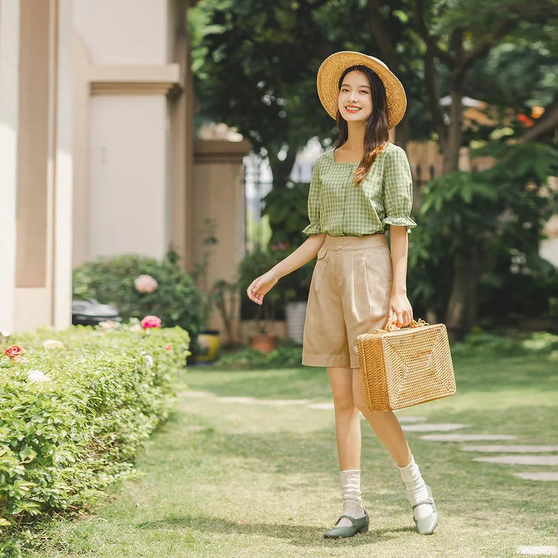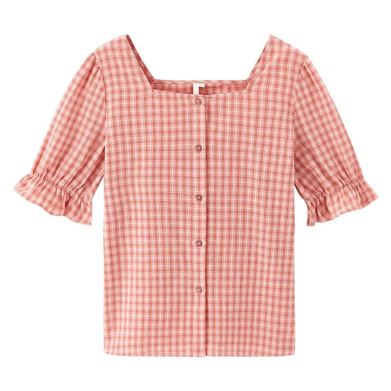 Блузка из хлопка и льна, с квадратным вырезом и коротким рукавом