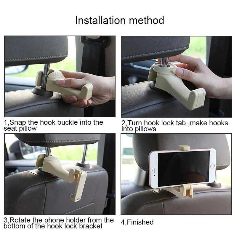 Это Автомобильный крючок на подголовник Встроенный складной держатель для телефона, что позволяет организовать вам вещи и играть в телефон одновременно во время вождения. Универсальная вешалка крючок для автомобильного сиденья обеспечит вам лучший опыт путешествий.