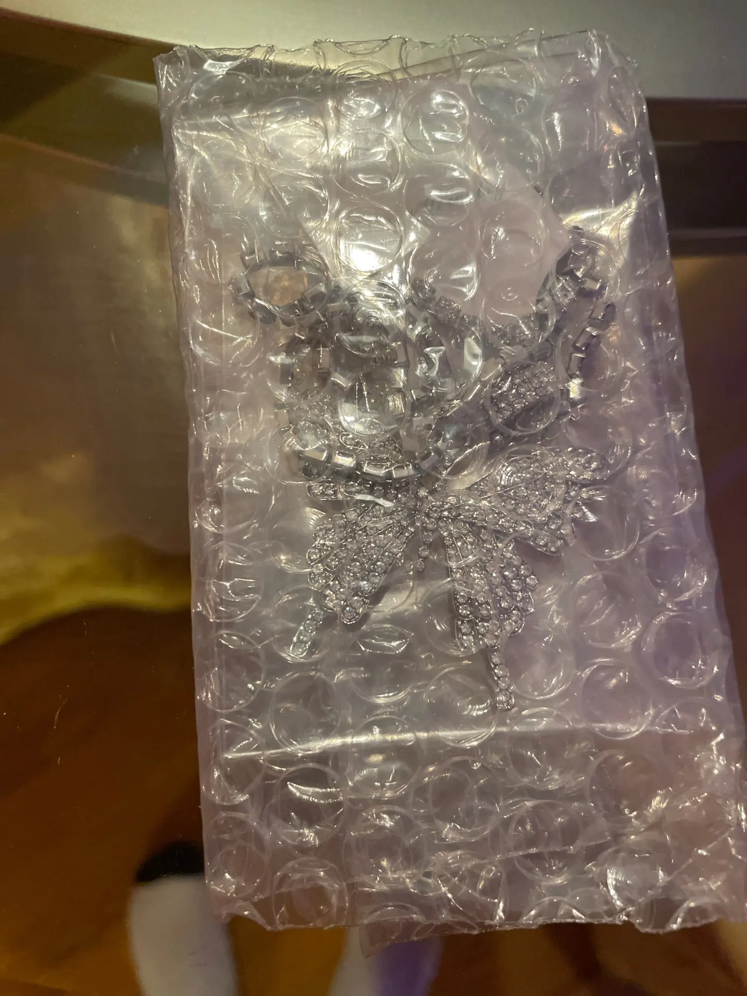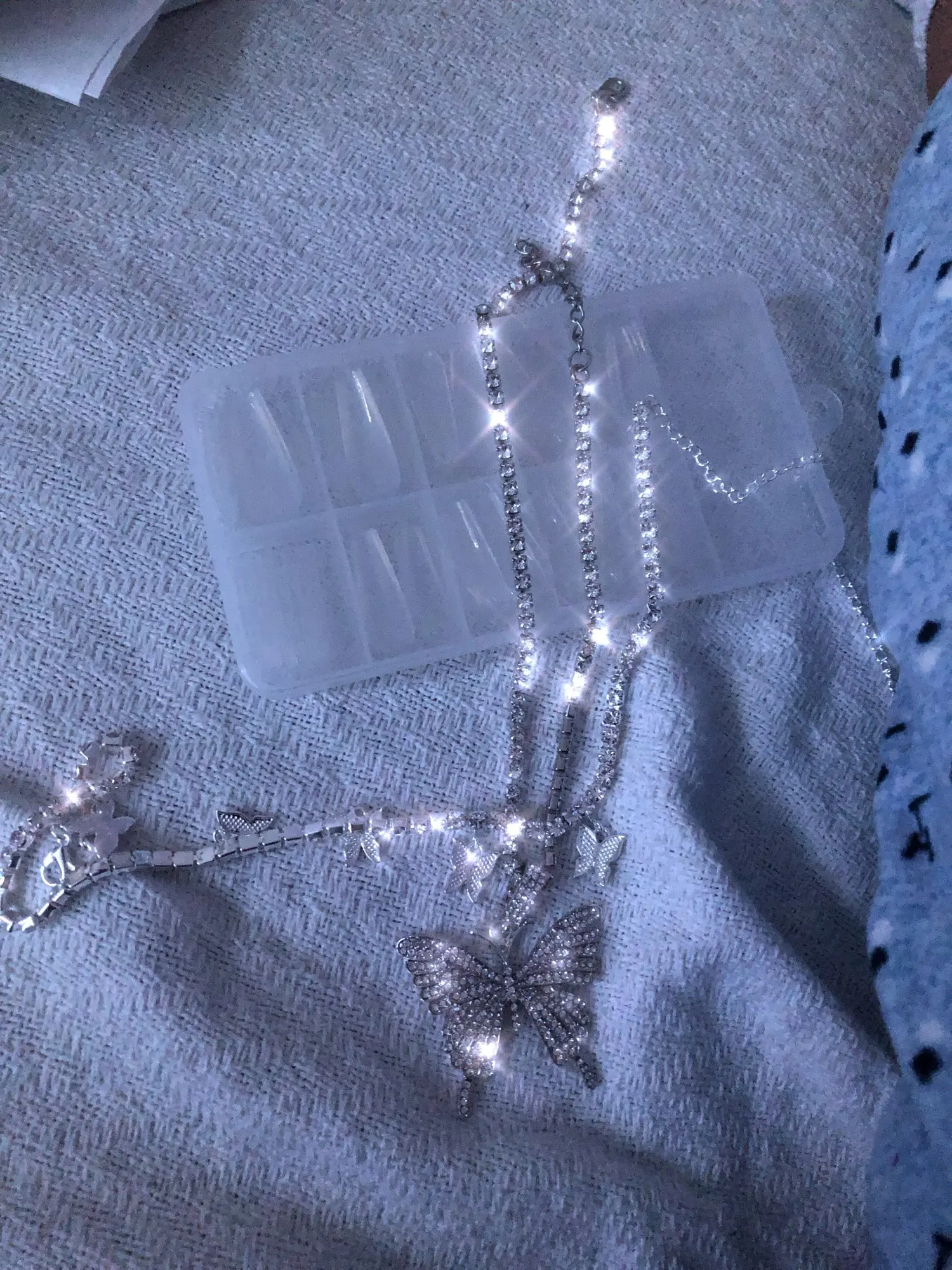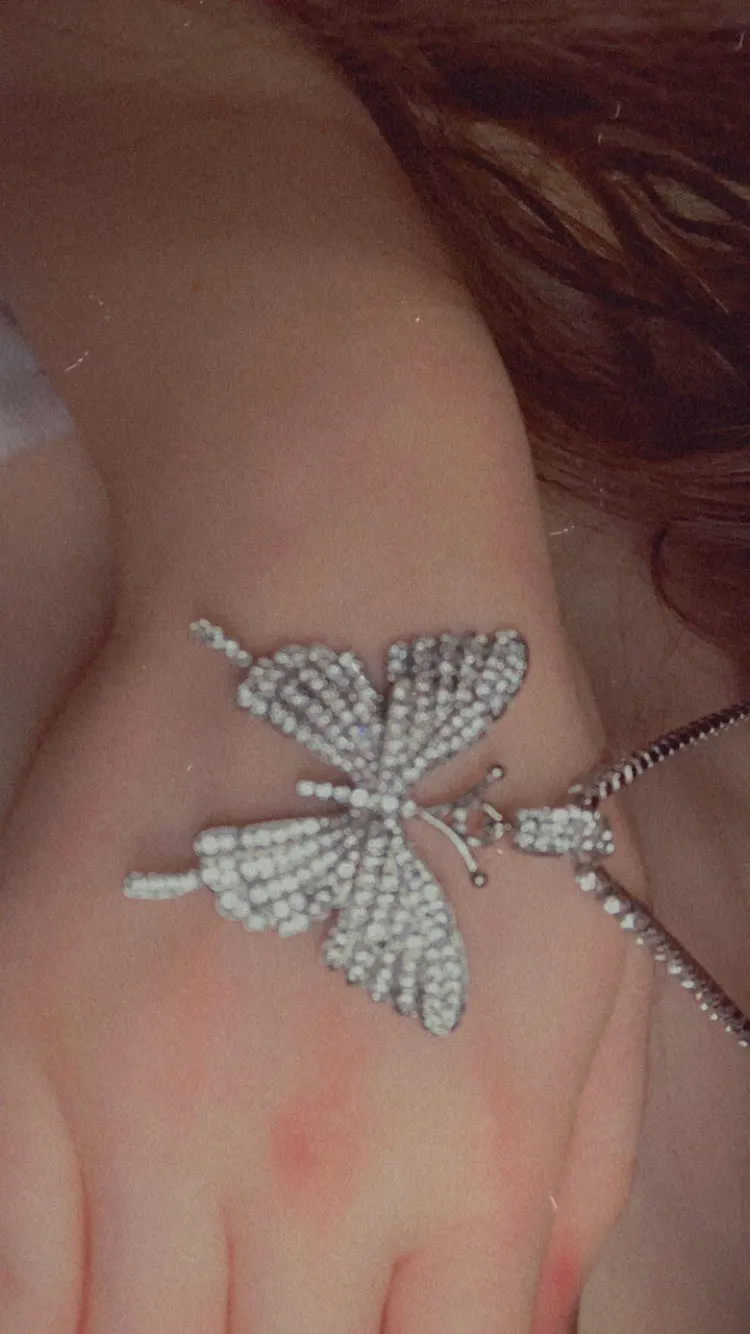 Очень понравилось колье-цепочка, очень красиво переливаются камни. Сама бабочка среднего блеска. С цепочки легко снимается скорее всего буду носить без неё.