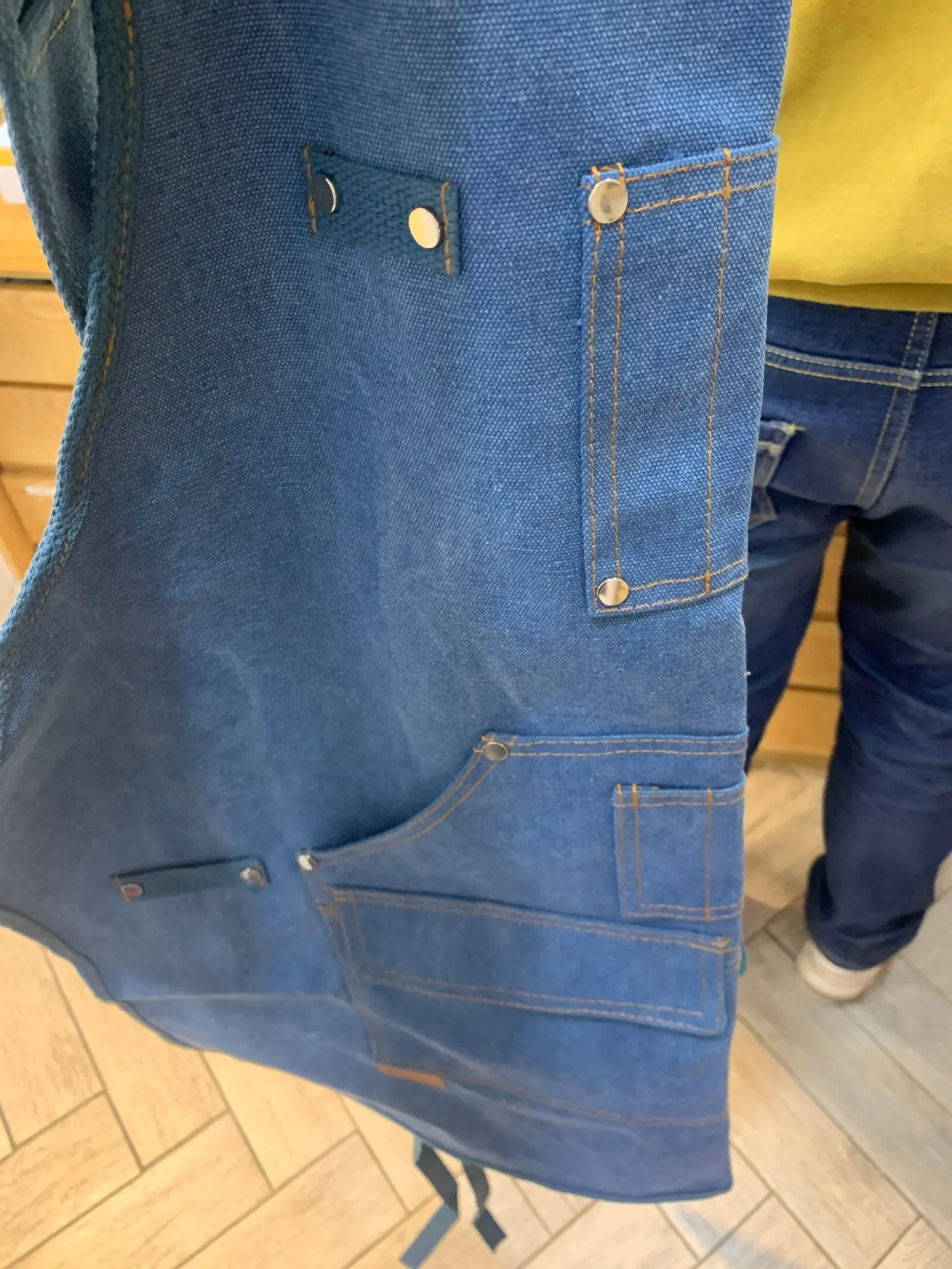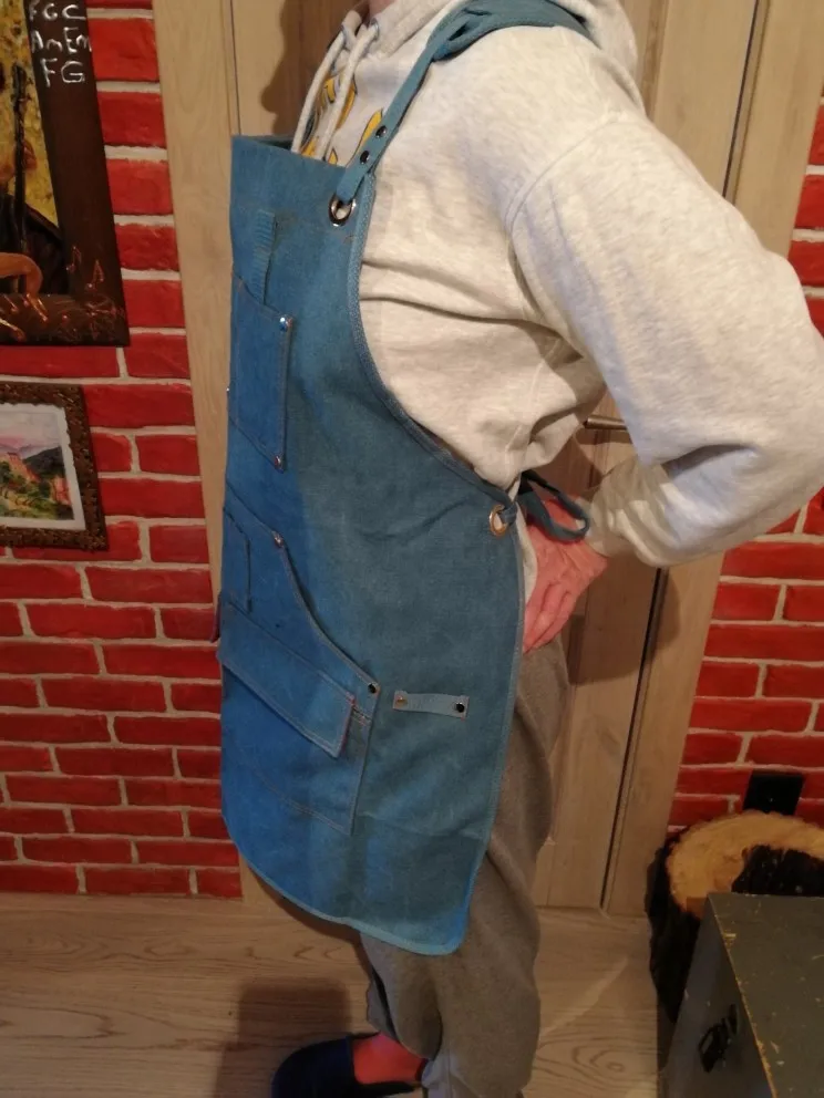 Фартук замечательный, удобный, сшик хорошо. Плотная джинса. Долгая доставка. Зависло на таможне на месяц. Груз отправили сборной доставкой, сразу 3 трека