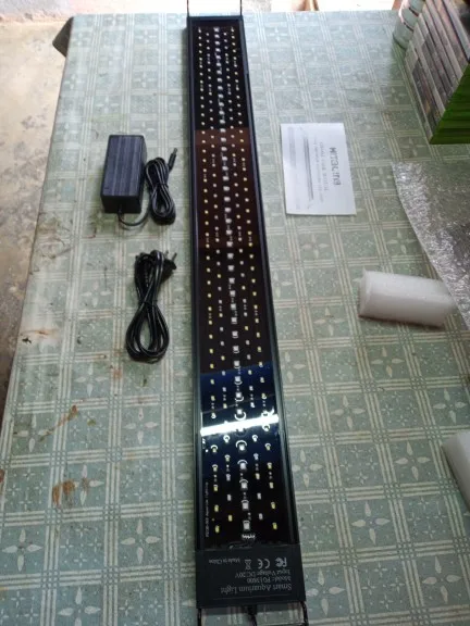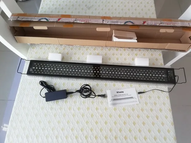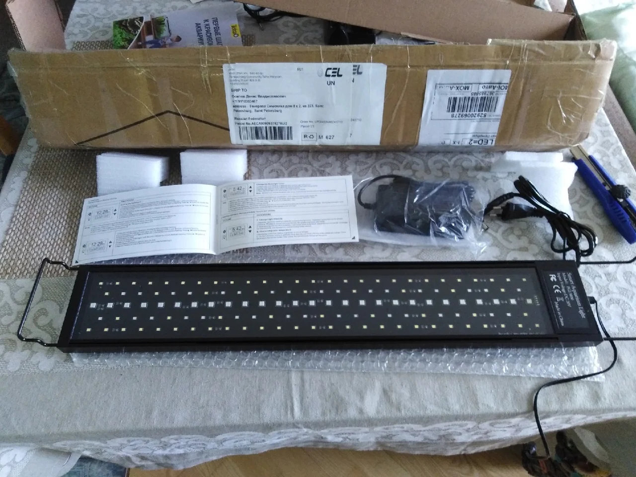 Отзывов пока немного по этому светильнику, поэтому с удовольствием напишу. Упакован товар отлично, доставка по России осуществлялась компанией DPD, прямо до дверей, ни каких дефектов упаковки не обнаружил. Светильник выглядит вполне прилично, качество порадовало. Брал 60см на аквариум 70см, света по первым ощущениям вполне хватает. Пока не настраивал просто включил. На мои 120 л- 34 вт вполне. Есть инструкция на английском, вилка евро. Вообщем светильник и магазин рекомендую.