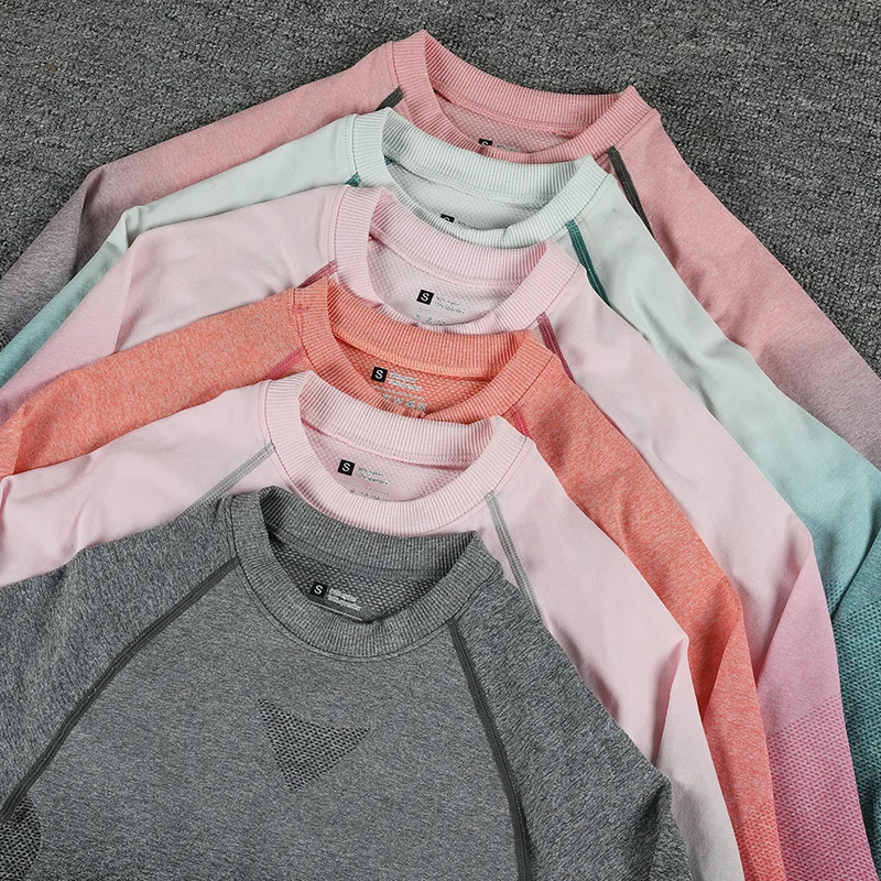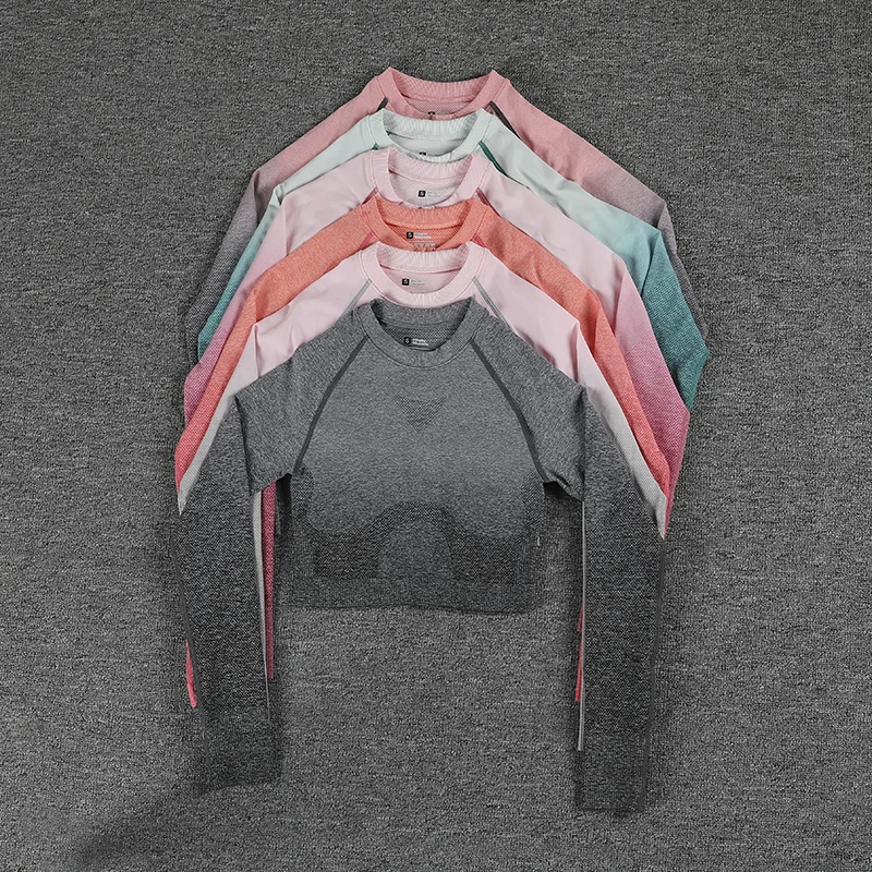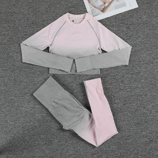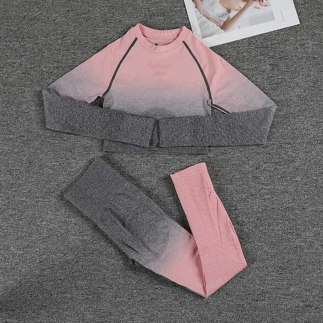 Sem costura gradiente леггинсы + манга longa conjunto de yoga feminino colheita Улучшенная cintura alta calas esportivas ginasio
