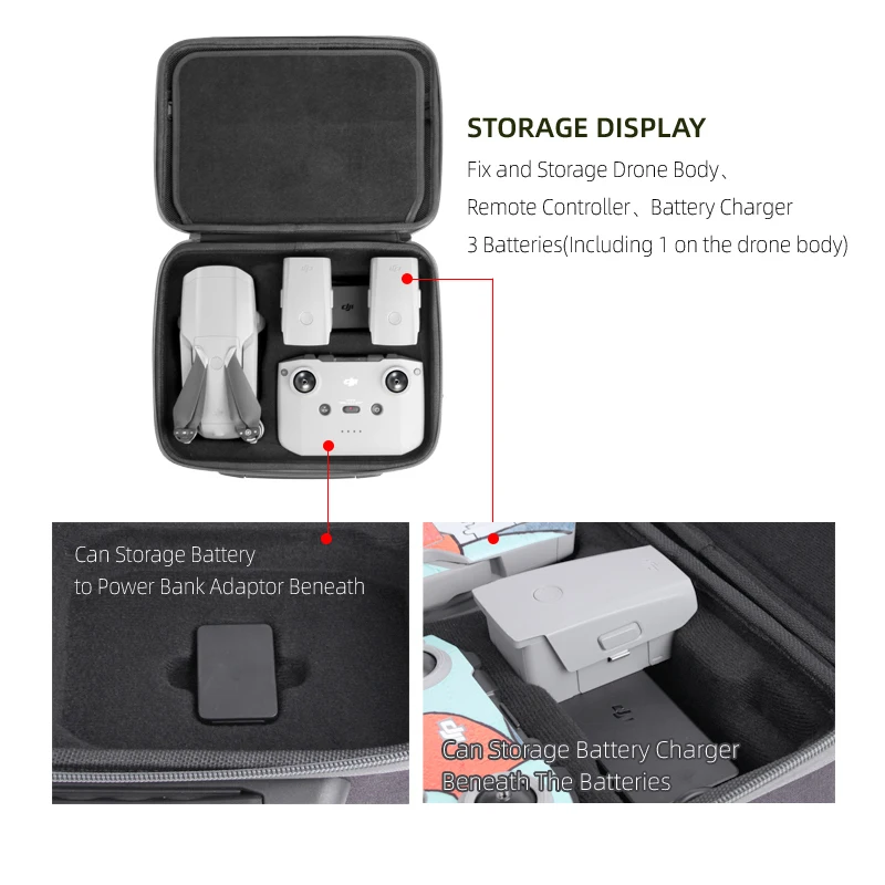 Описание: Материал: нейлон + мягкий бархат Размеры: 29*24*10 см Использование: может хранить 3 батареи (в том числе один установлен на фюзеляже)/зарядное устройство/пульт дистанционного управления/Дрон/другие аксессуары. Отправить список: 1 * Портативный сумка 1 * плечевой ремень