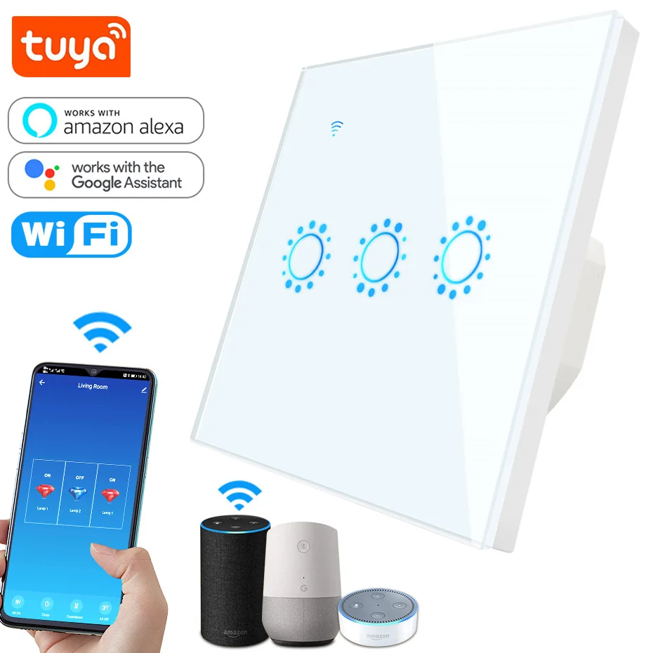 Tuya WiFi Smart Switch, ЕС 86 сенсорный настенный выключатель 1 2 3 Gang Alexa совместимый светильник, переключатель 10A 90-250 В, функция таймера Google Home