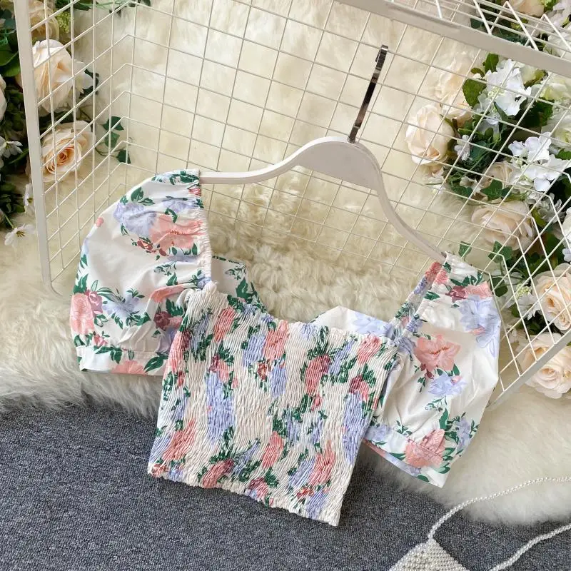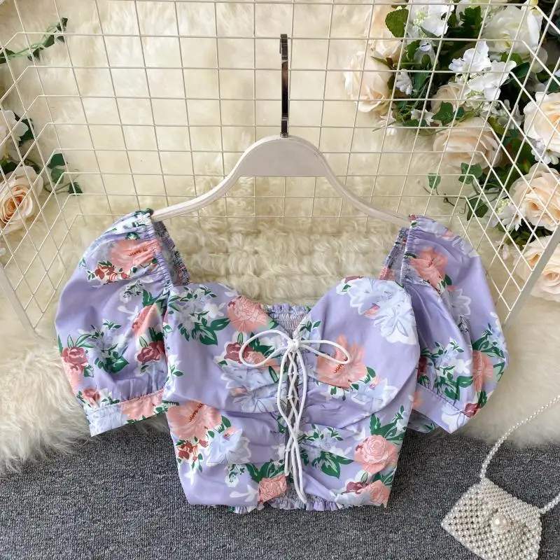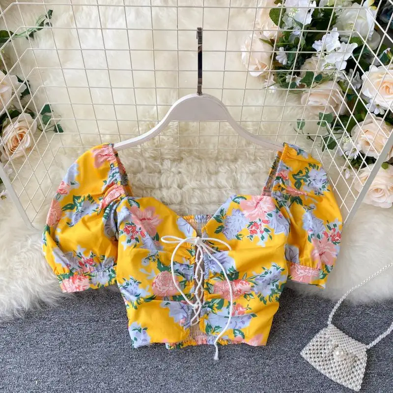 Женские короткие топы с пышными рукавами, модная новая пикантная короткая блузка с принтом на шнуровке, рубашки с воротником-лодочкой, L935, 2020