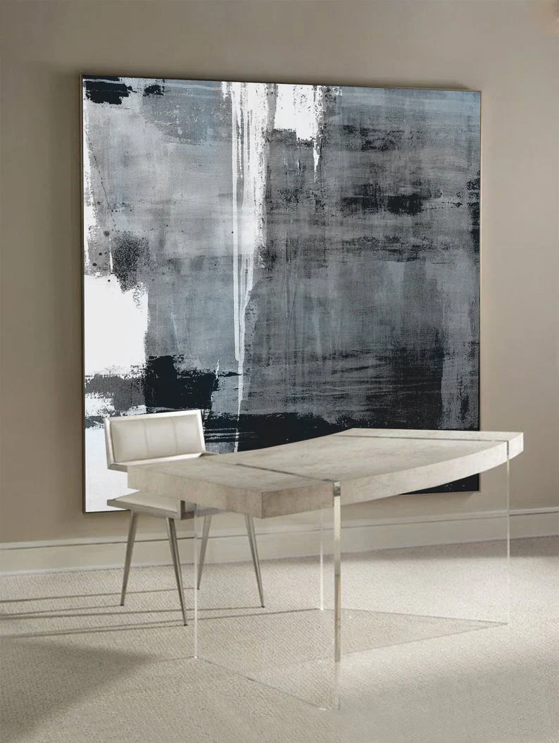 Большая минималистская живопись, холст, черно-белая живопись на холсте, оригинальное искусство на холсте, очень большая настенная живопись, серая живопись