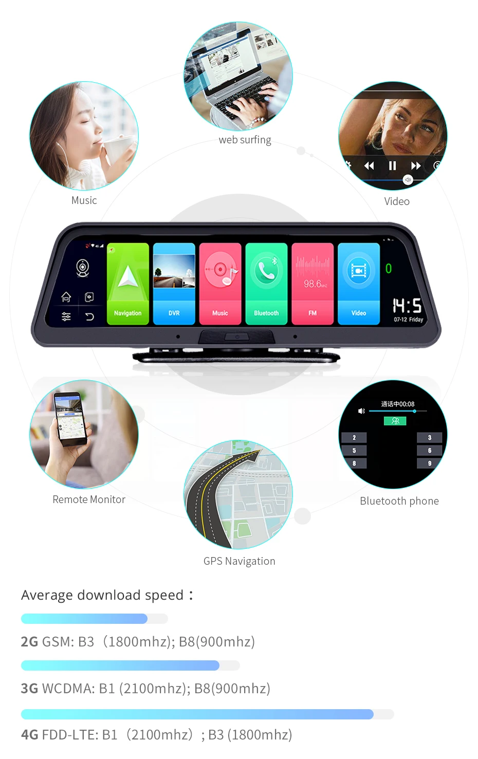 Поддерживает мобильную сеть 4G. Сетевой диапазон: 4G/LTE: FDD,2100(B1); 3G/WCDMA: 2100(B1)/900(B8); 2G/GSM: 900(B8)/1800(B3). Делает ваш видеорегистратор серфингом в Интернете, в любое время и в любом месте. Примечание: Перед покупкой проверьте свой местный сетевой диапазон 4G. Спасибо.