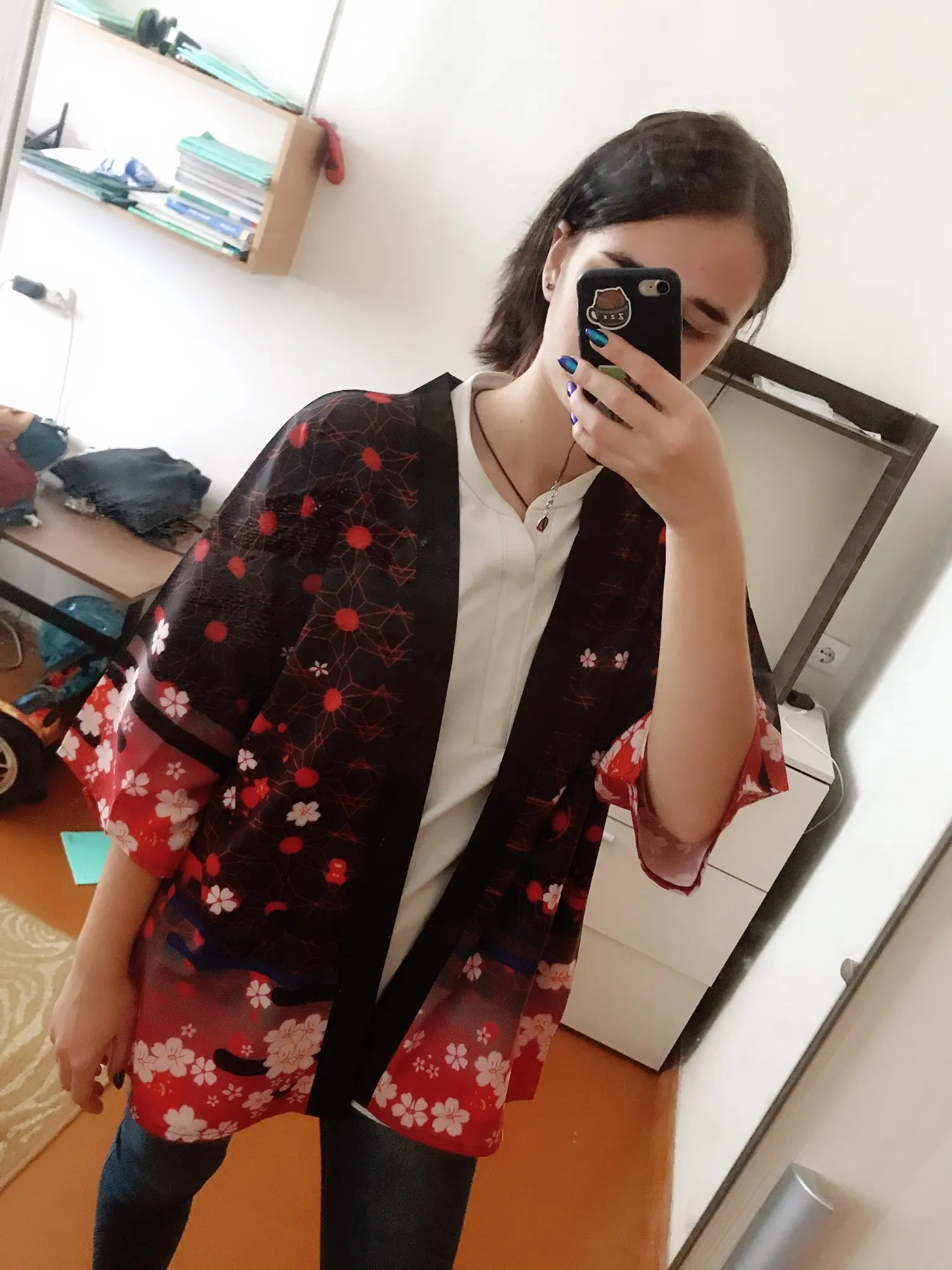 Отличное хаори) Качественный принт, приятное к телу Сшито также хорошо, нитки не торчат Единственное - слабый запах, но это нормально для новой вещи, со стиркой уйдёт