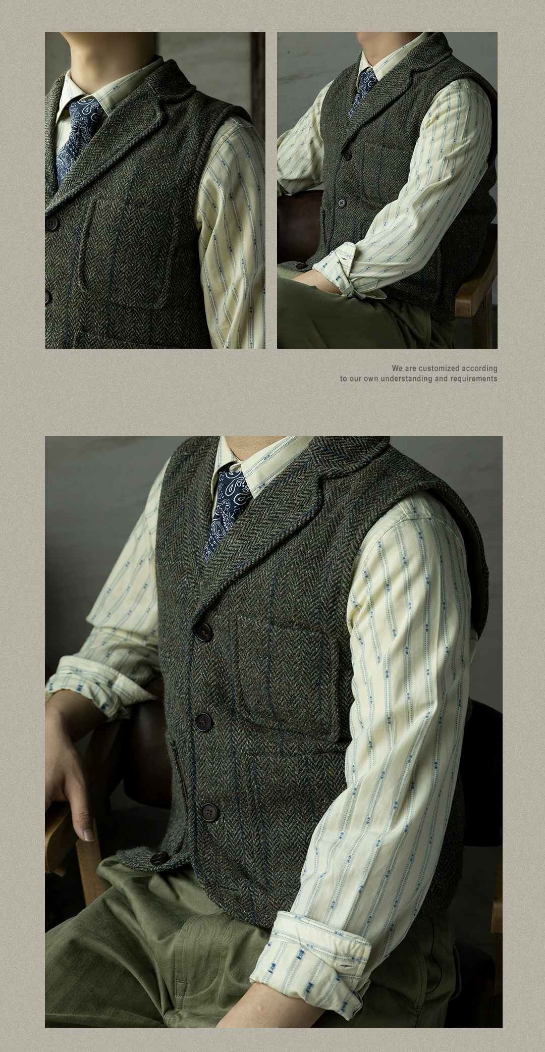 100% шерсть Винтаж стильный жилет 560 GSM Мужские Повседневное твид...
