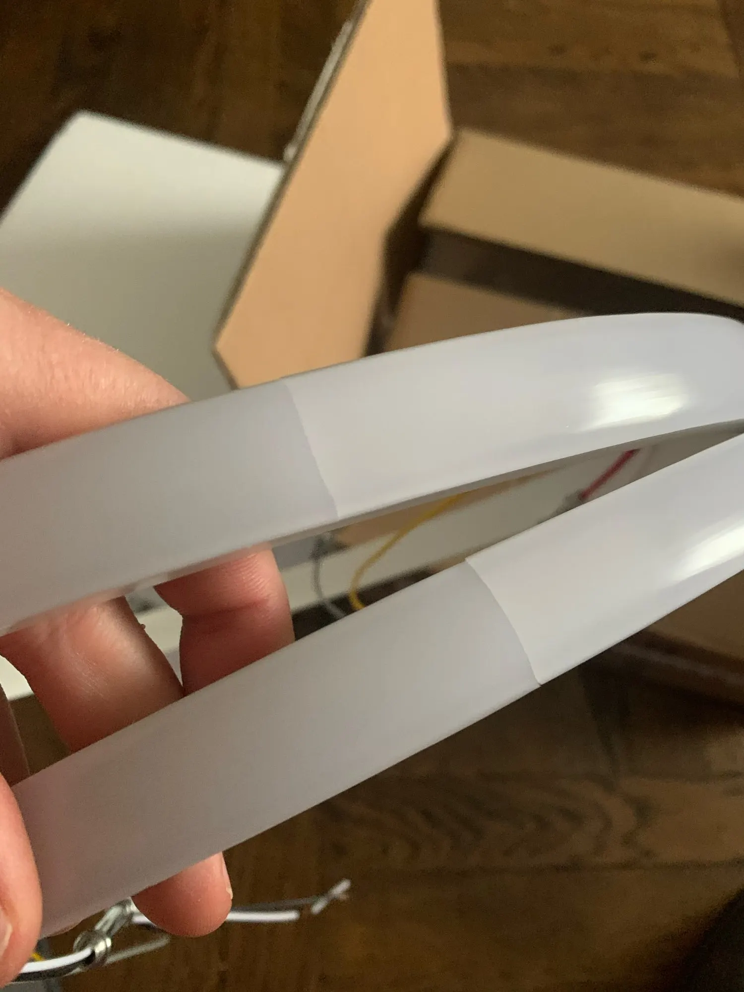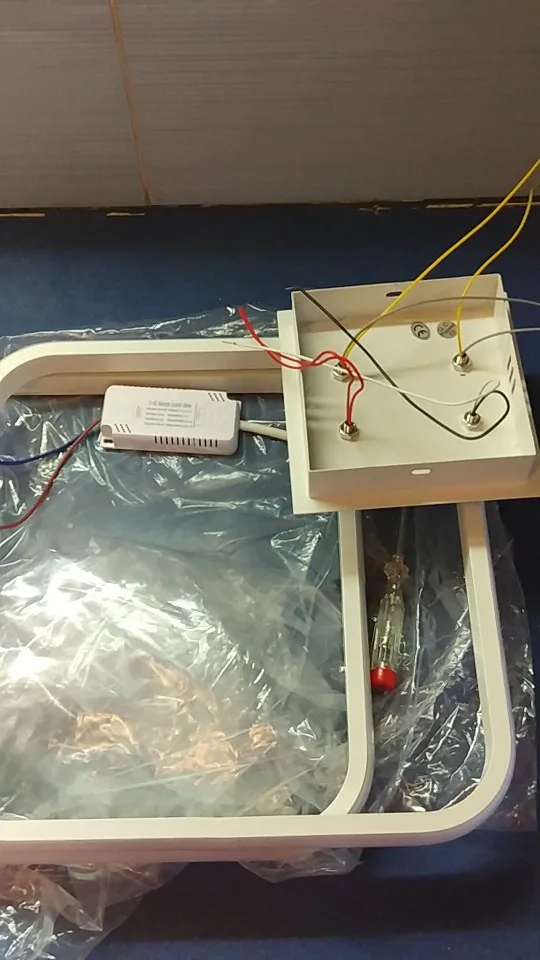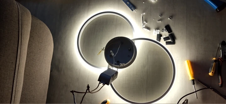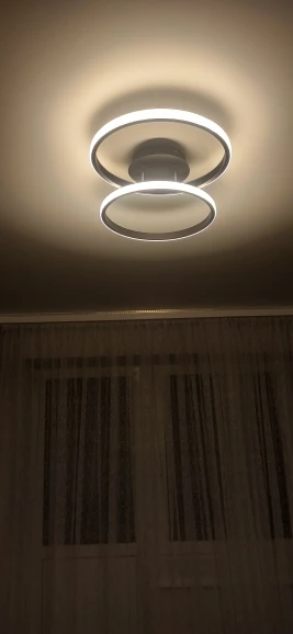 На обеих кольцах были трещины, из далека их не видно и на функционал они не влияют. Пульт управление к сожалению не работает. Режимы света лампы меняется путём несколько нажатий на выключатель.