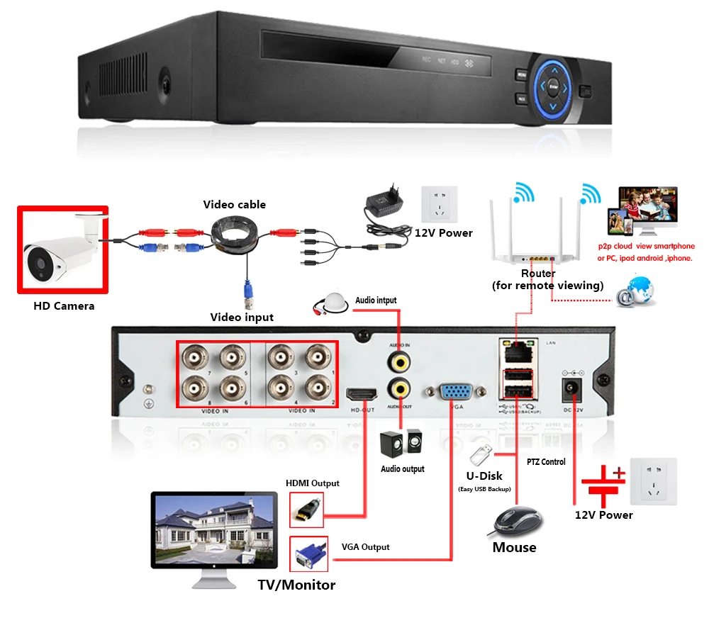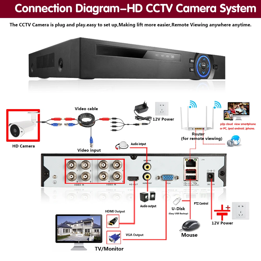 Простая настройка, всего 4 шага для просмотра мобильный телефон, просмотра видео в режиме реального времени из любого места и в любое время с помощью смартфона, стола или ПК с передовой технологией P2P, вы можете получить удаленный доступ к вашей системе за считанные минуты или меньше, нет необходимости в переадресации, удаленный доступ никогда не был таким простым