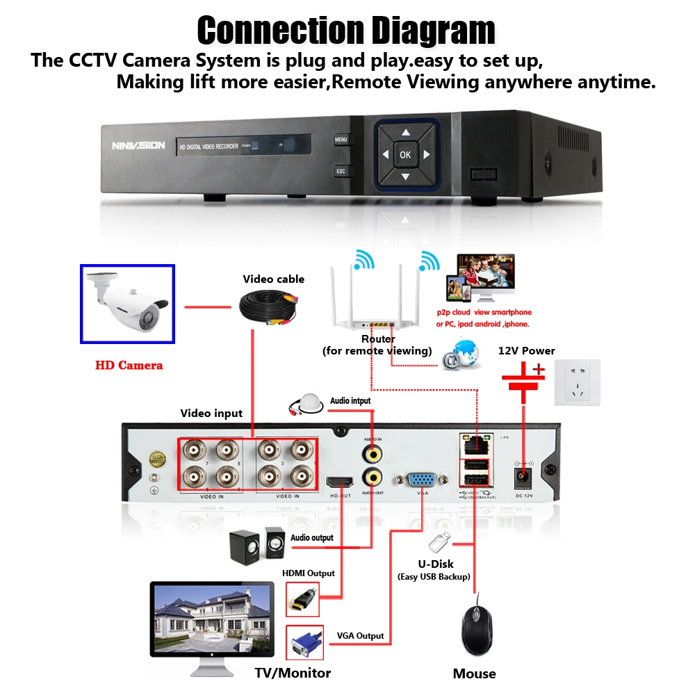 Простая настройка, всего 4 шага для просмотра мобильный телефон, просмотра видео в режиме реального времени из любого места и в любое время с помощью смартфона, стола или ПК с передовой технологией P2P, вы можете получить удаленный доступ к вашей системе за считанные минуты или меньше, нет необходимости в переадресации, удаленный доступ никогда не был таким простым