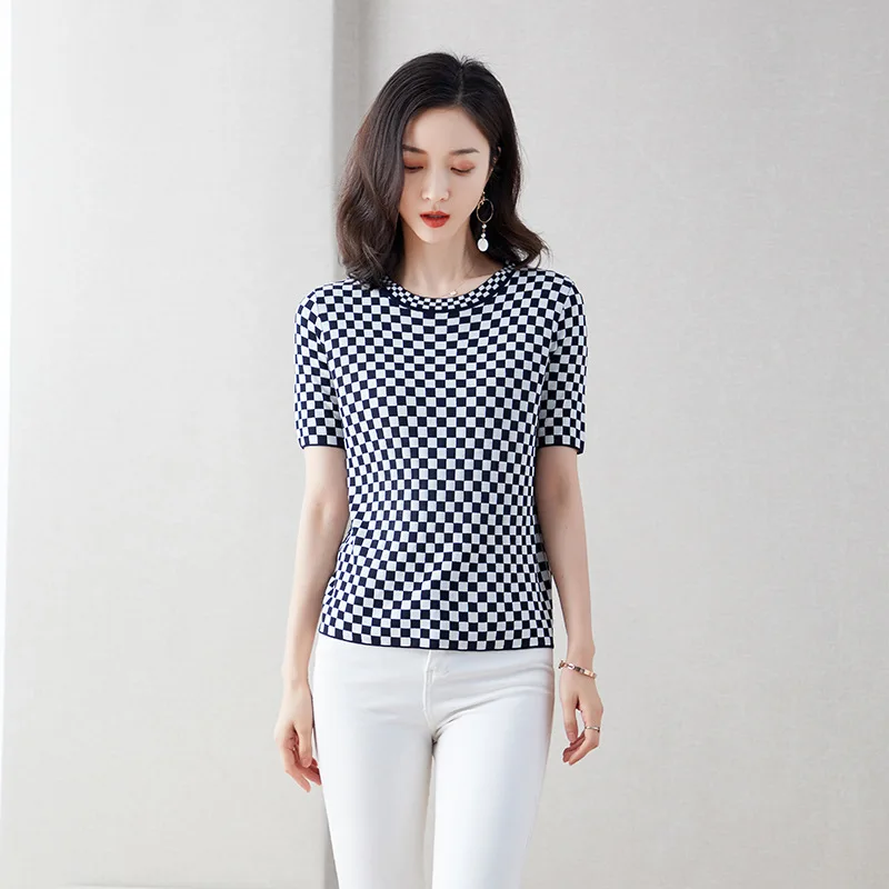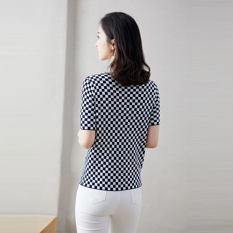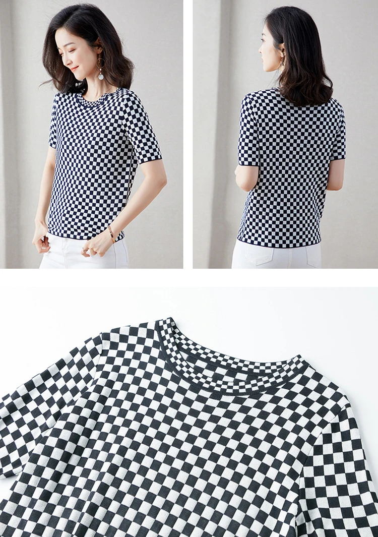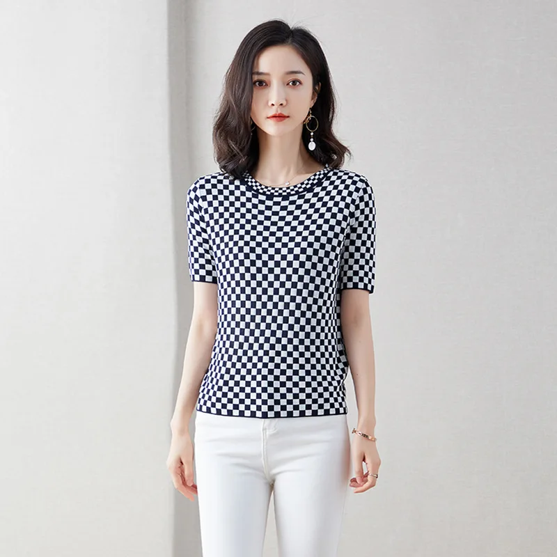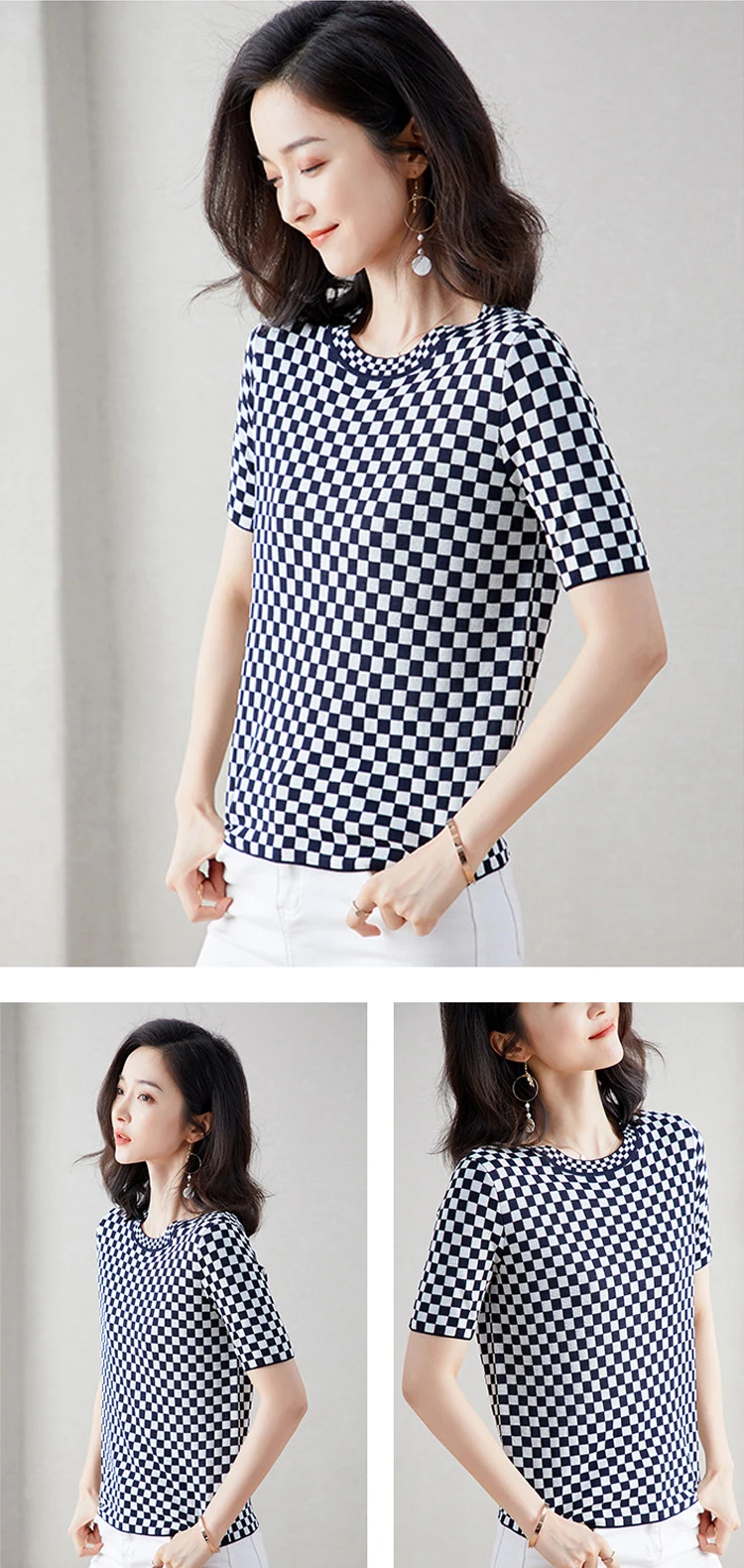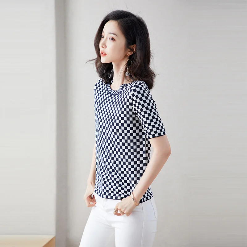 Вязаный пуловер, женский свитер, лето 2020, с коротким рукавом, тонкий, с круглым вырезом, в клетку, пуловер, джемперы, Женский трикотажный топ