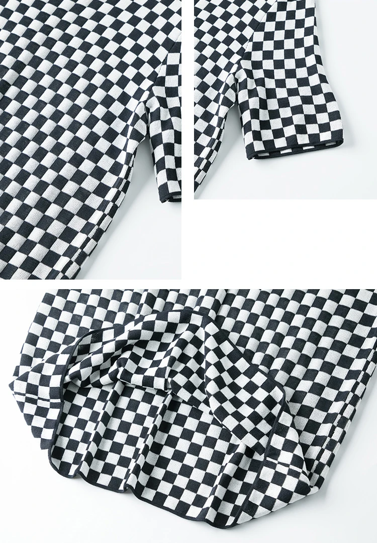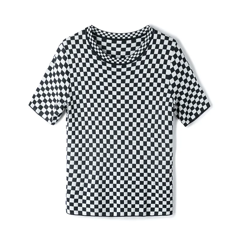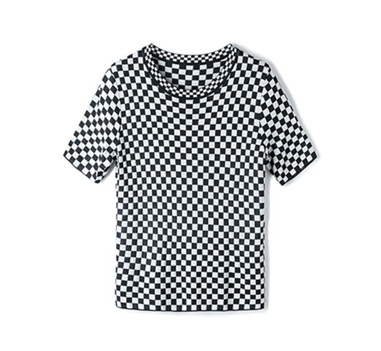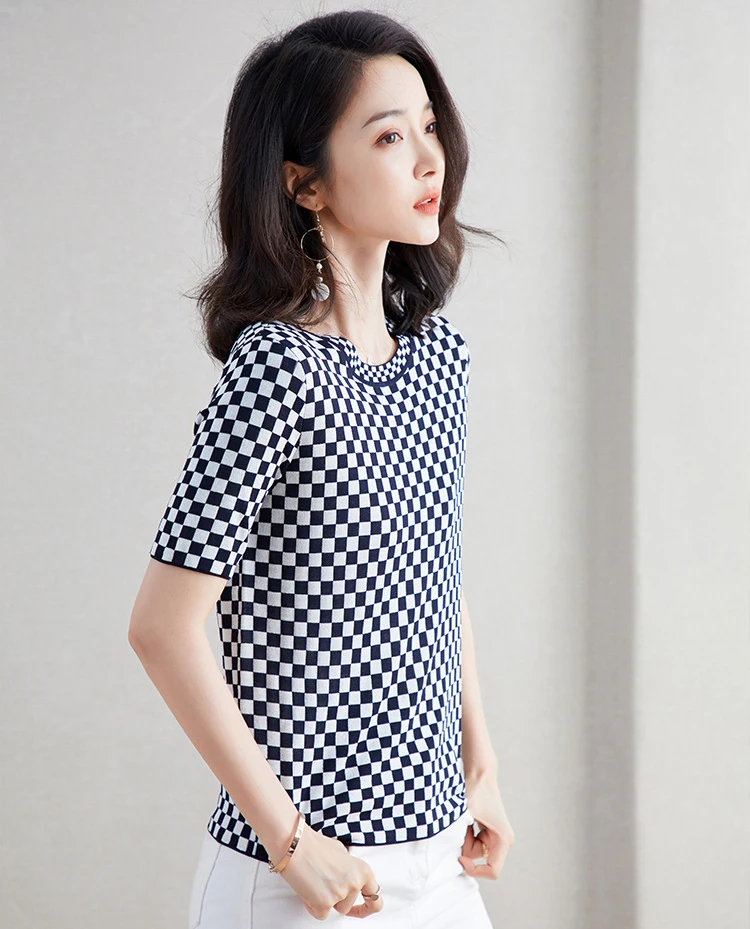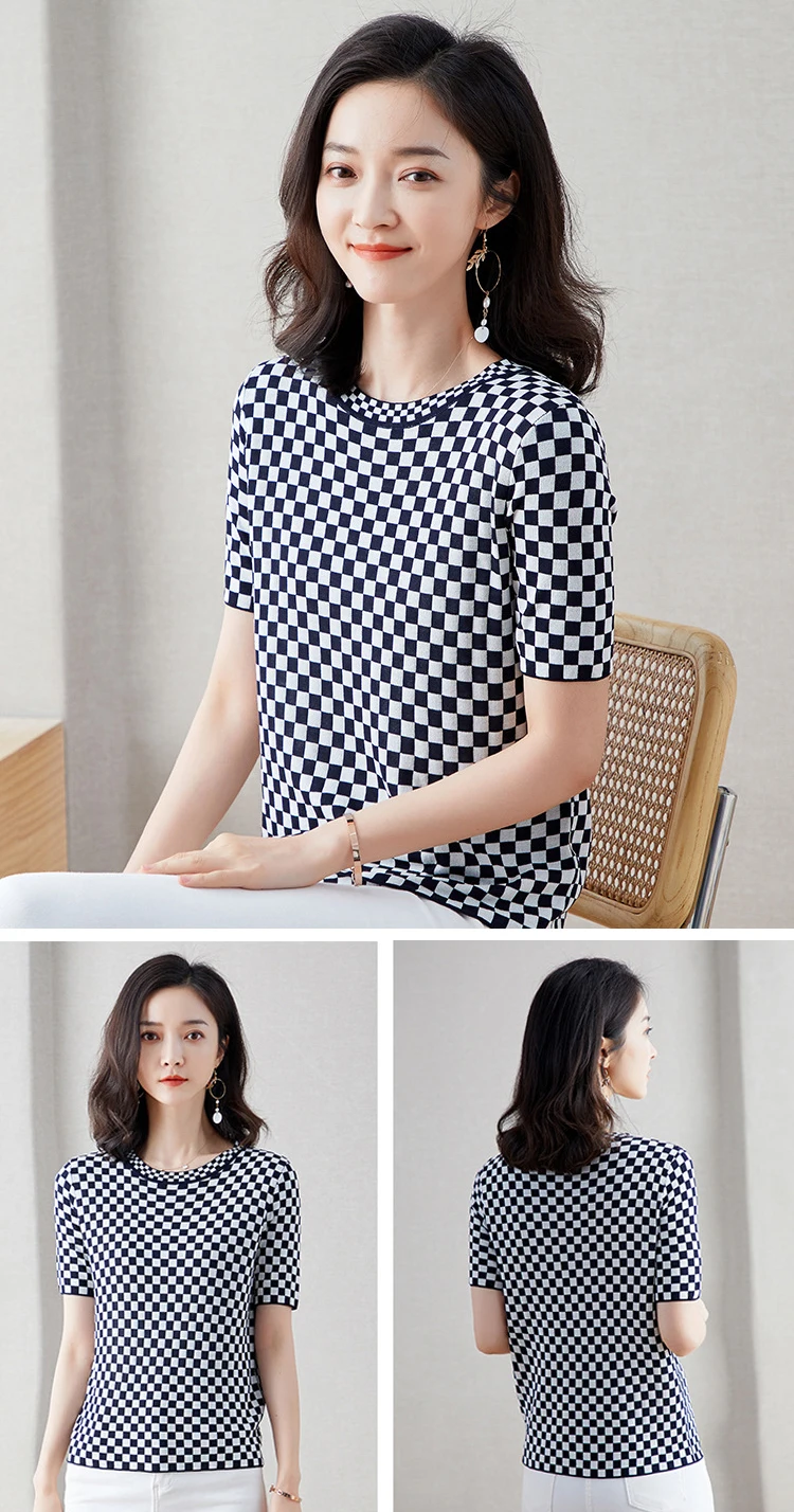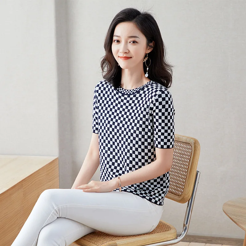 Вязаный пуловер, женский свитер, лето 2020, с коротким рукавом, тонкий, с круглым вырезом, в клетку, пуловер, джемперы, Женский трикотажный топ