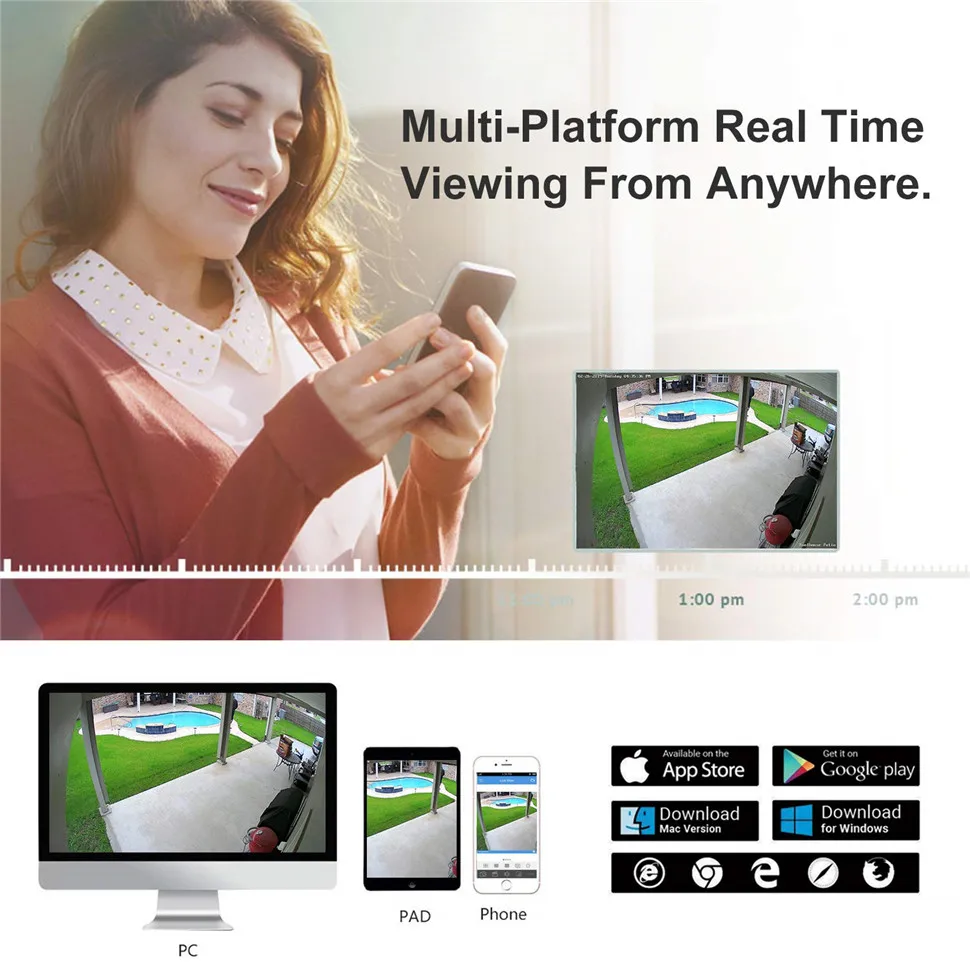 Когда вы выходите на улицу, вам не нужно беспокоиться о безопасности вашей собственности. Используя эту систему видеонаблюдения, вы можете одновременно просматривать видео в реальном времени в любое время и в любом месте с Wi-Fi/4G на смартфоне/iPad/ПК.