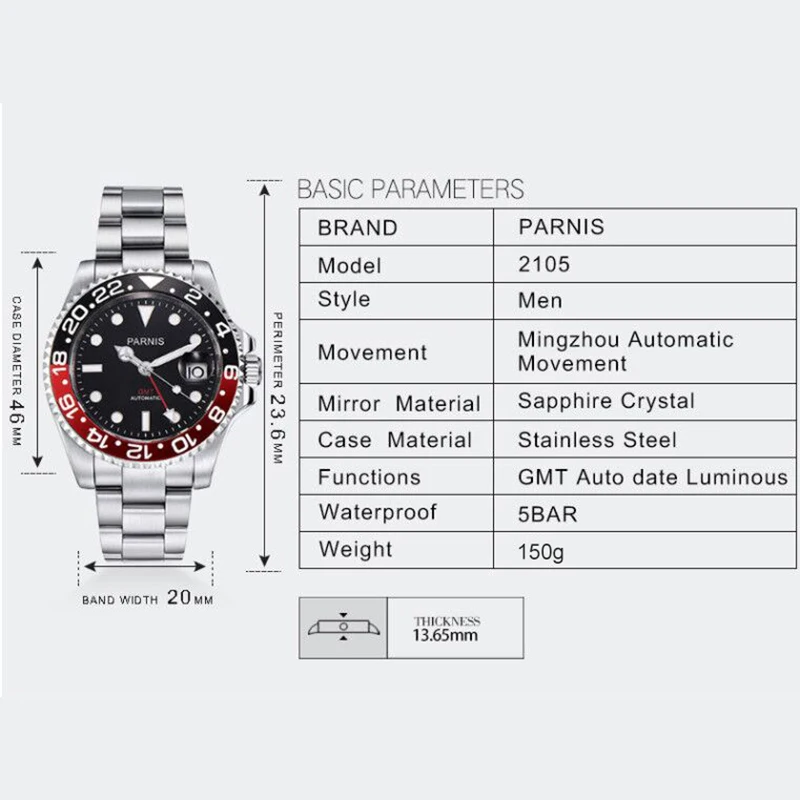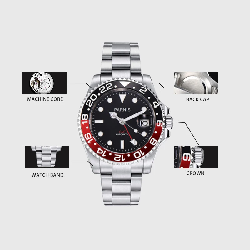 Мужские наручные часы, мужские автоматические часы PARNIS GMT Роскошные Мужские автоматические механические наручные часы водонепроницаемые часы сапфировые часы