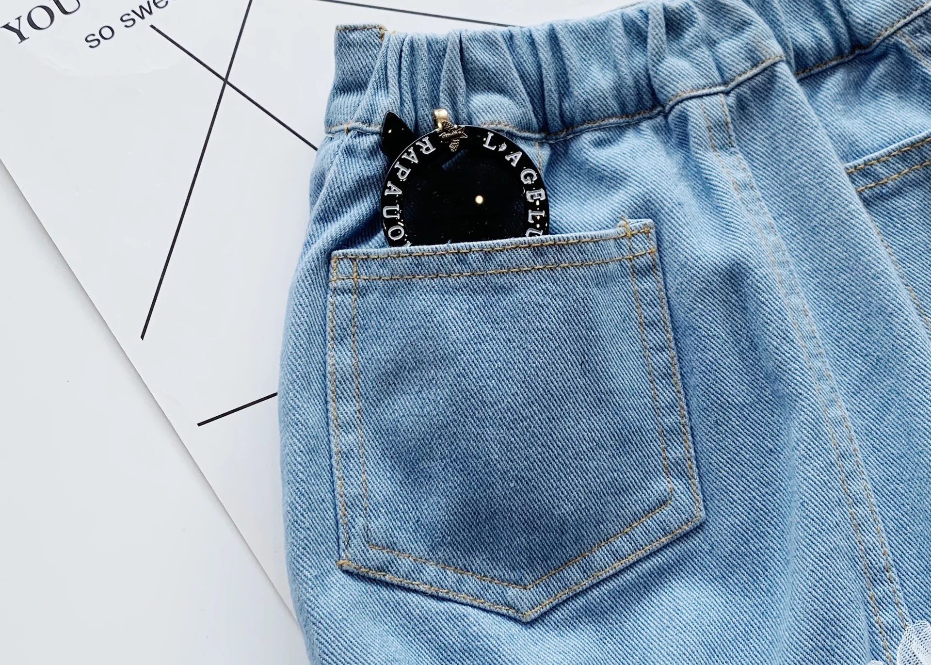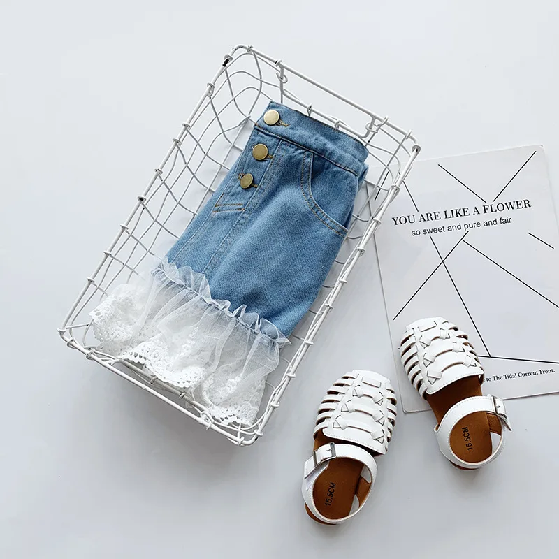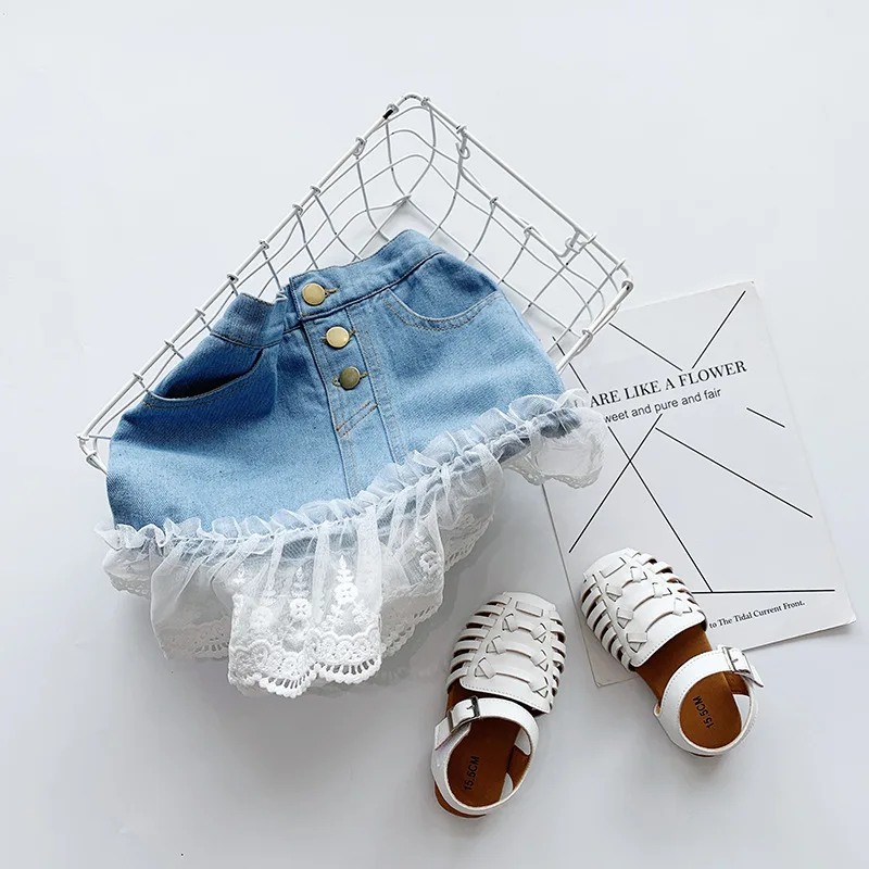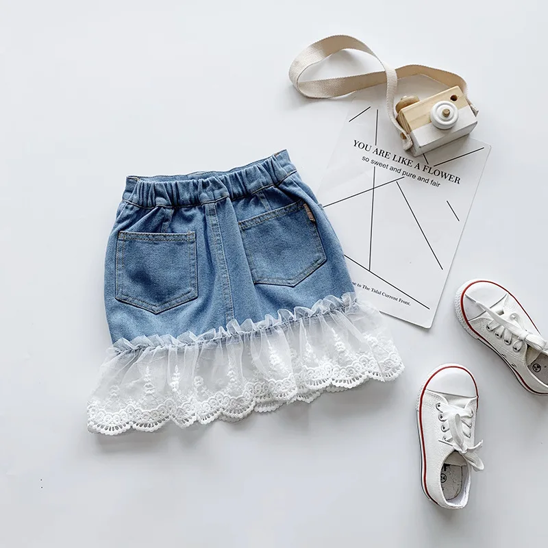 Новинка 2021, летняя юбка для девочек, детская джинсовая юбка с кружевным подолом