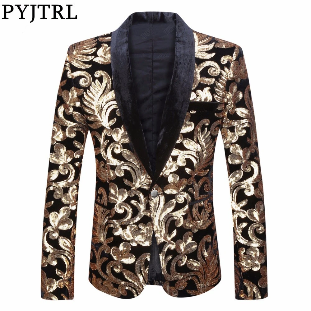 PYJTRL блестки бархатная серия Мужская шаль отворот блейзер дизайн черный бархат золотые цветы Блестки костюм куртка DJ клуб певец одежда