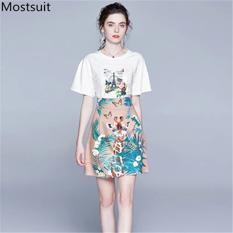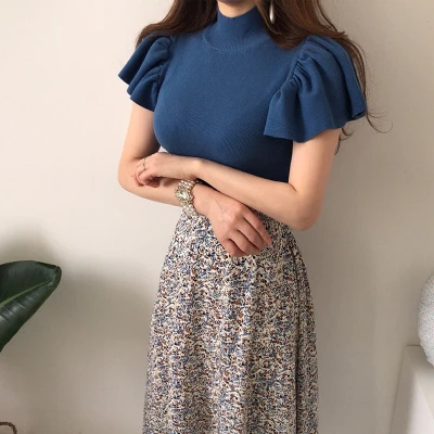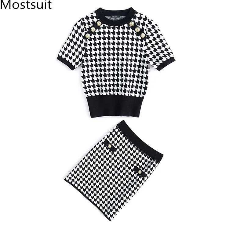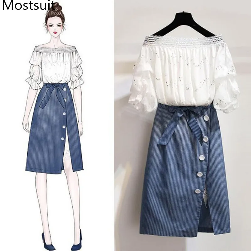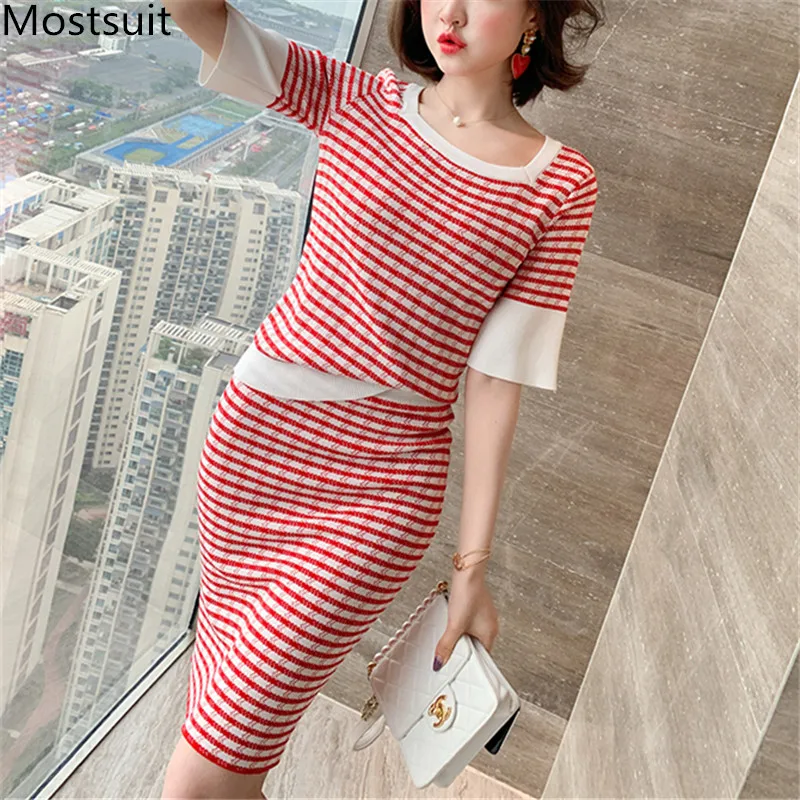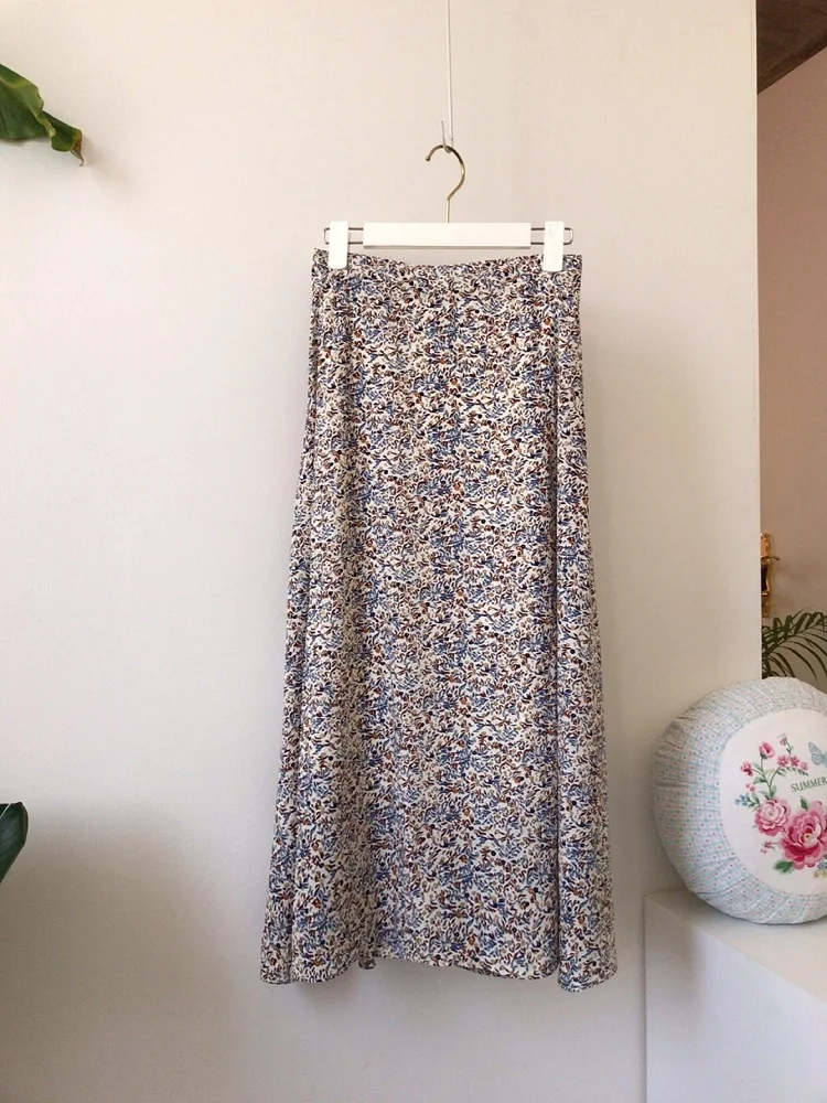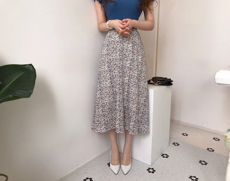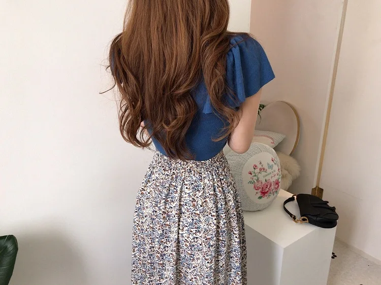 Комплект с юбкой Женский трикотажный из двух предметов, модный винтажный элегантный костюм из синего трикотажного топа и длинной юбки с принтом на резинке, в Корейском стиле, лето 2020