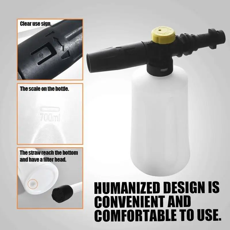 Цвет: белый Материал: инженерный пластик Емкость: 750 мл Диапазон давления: 60 бар ~ 160 бар (900 psi ~ 2320 psi) Стиль: подходит для серии Kärcher K2-K7; Подходит для серии LAVOR; Подходит для серии BOSCH; Подходит для серии NISFISK; Подходит для серии YILI; Интерфейс quick plug 1/4 (дополнительно)