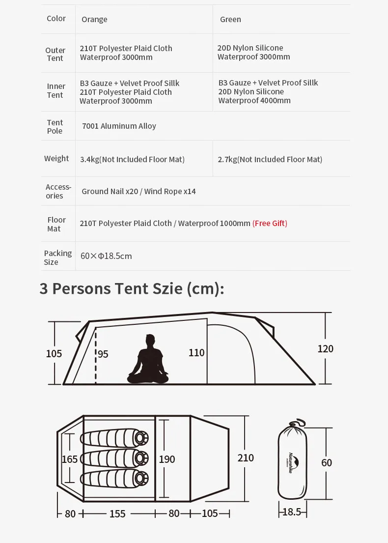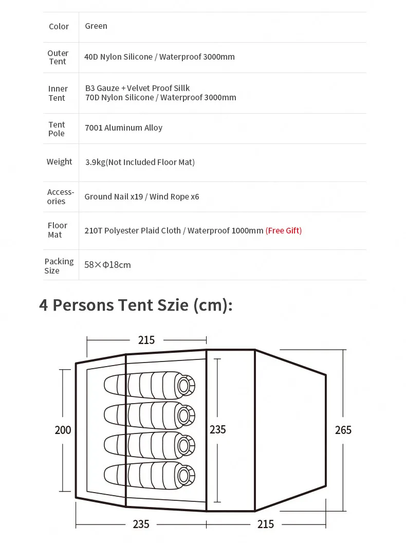 Внешняя палатка: 210T полиэстер плед (210T) / 20D нейлон силикон (20D) -Водонепроницаемый 3000 мм