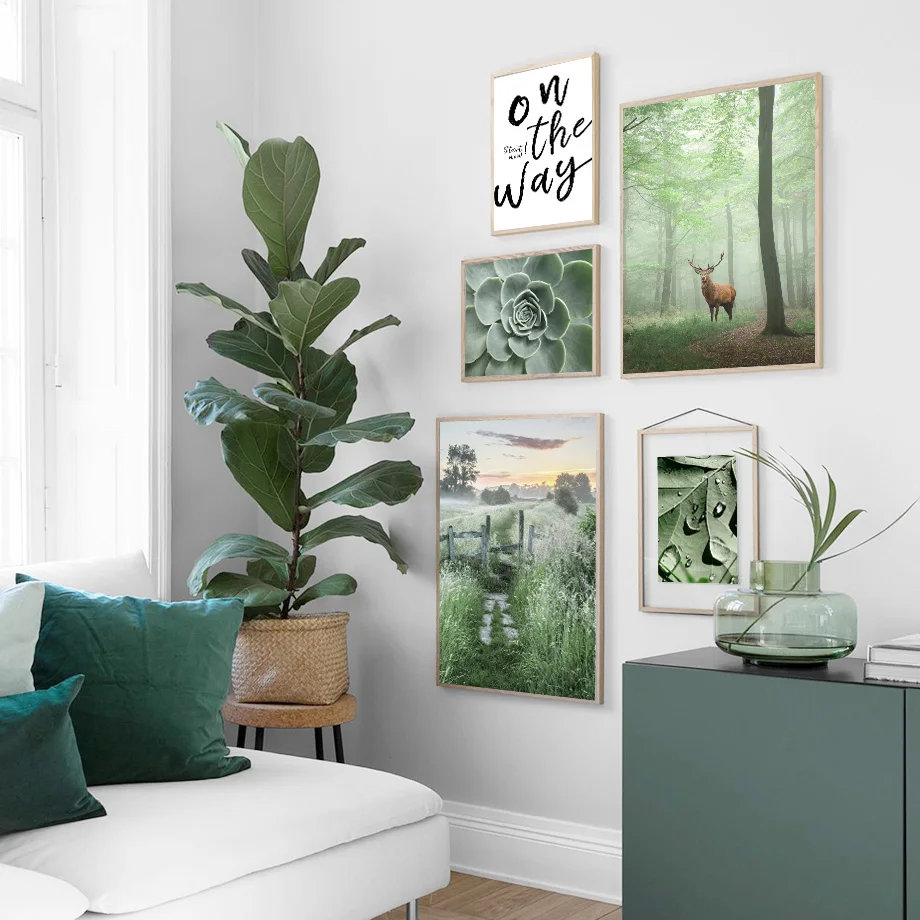 Картина на холсте с изображением лесной тропы, оленя, суккулентов, зеленая природа, постеры в скандинавском стиле для декора гостиной, печать, Картина Настенная