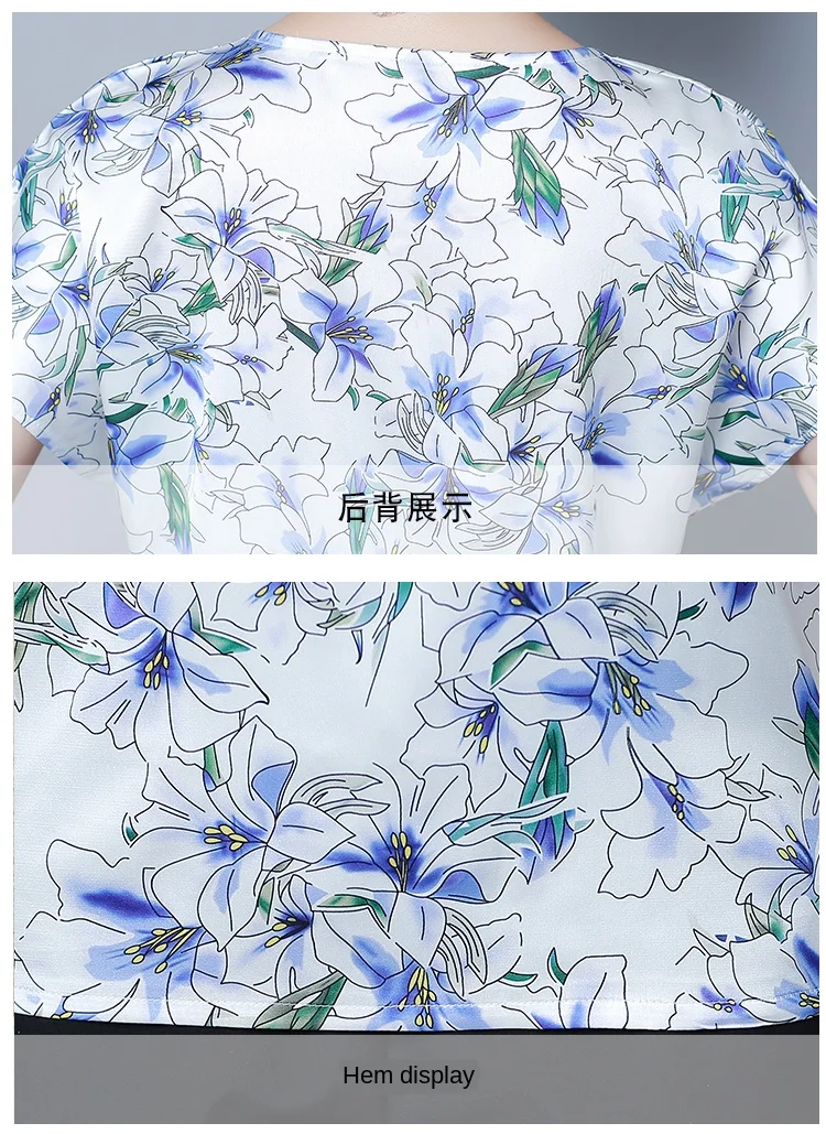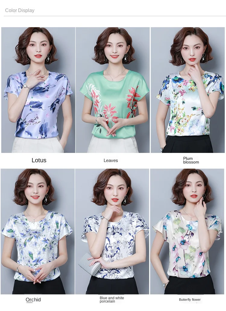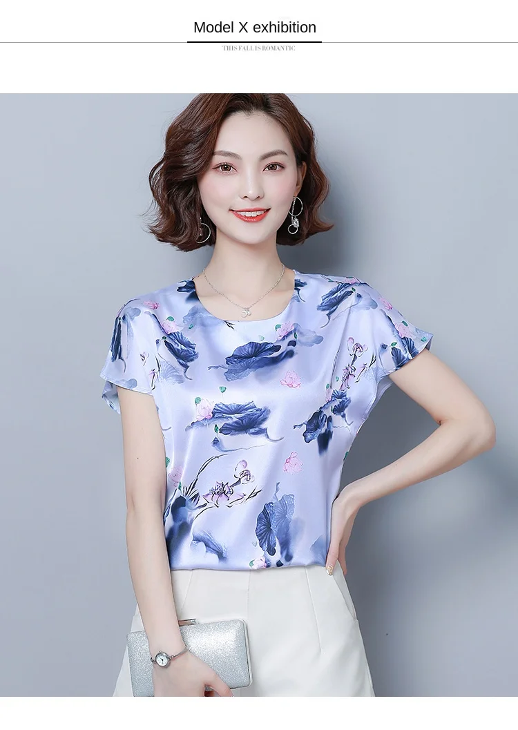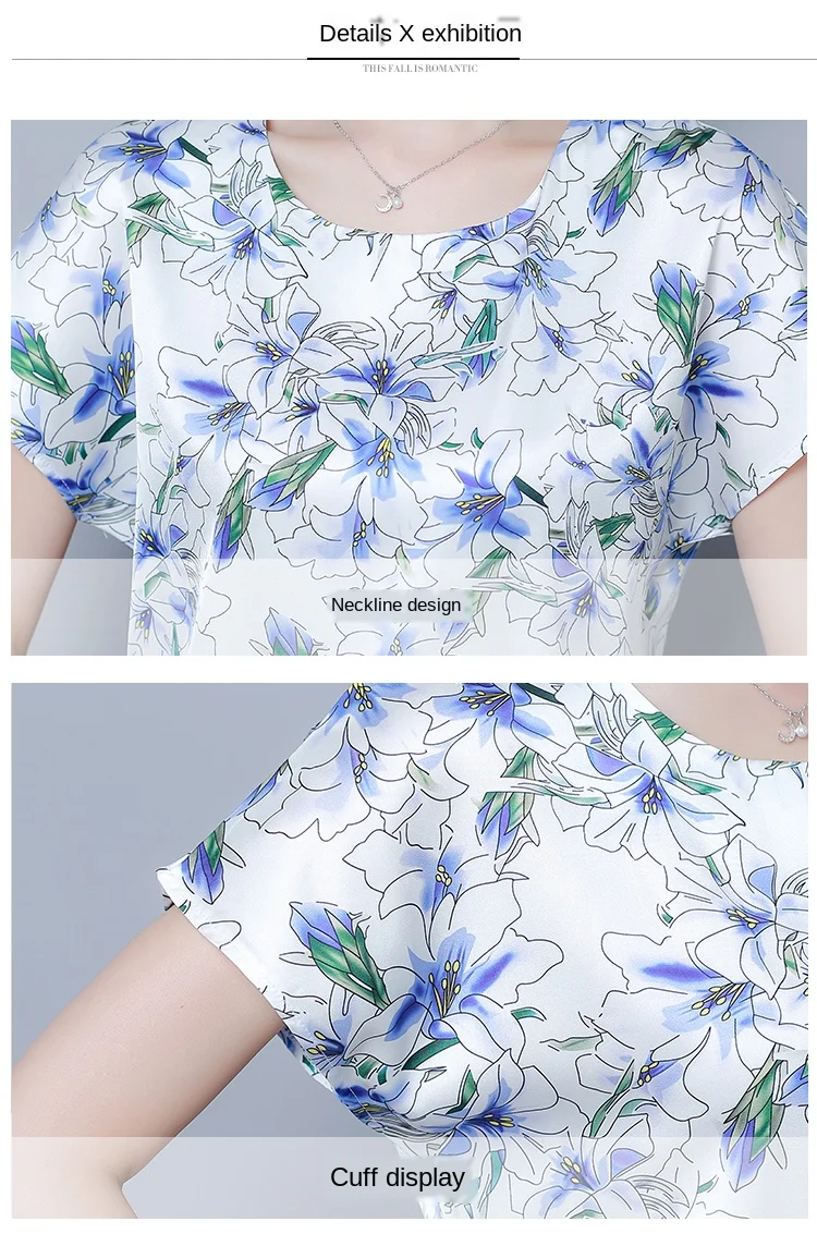Блузка женская, шелковая, с цветочным принтом, свободная, с коротким рукавом, круглым вырезом, лето размера плюс