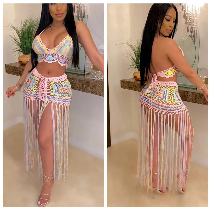 Новинка 2020, вязанное крючком пляжное платье, сексуальный женский кроп-топ + длинные юбки с кисточками, бикини, накидка для плавания, 2 шт.компл.