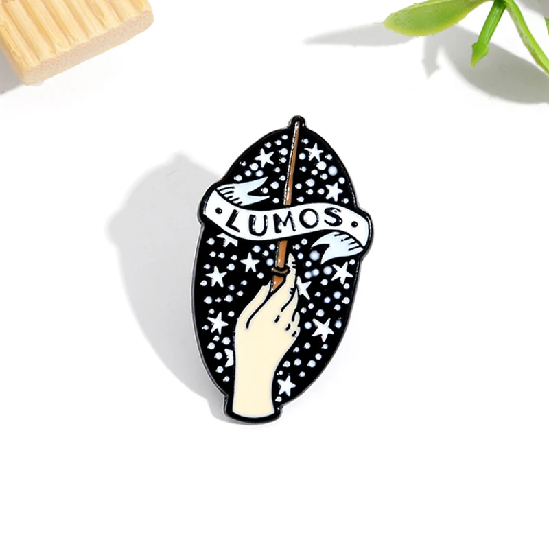 Волшебные заклинания LUMOS эмалевые Броши Булавки черные Волшебные заклинания палочка красивое звездное небо Хэллоуин ведьмы ювелирные броши