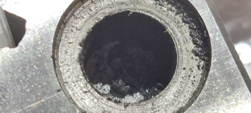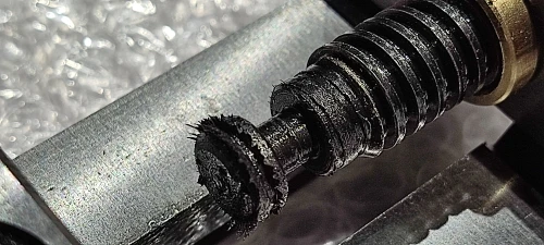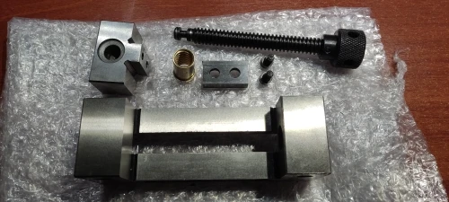 Задумка неплохая, но реализация подкачала. Основа тисков из довольно твёрдой стали, напильником тяжело берётся. Напильником сглаживал острые кромки, которые остались после шлифовки. Подвижная губка тоже твёрдая, но почему-то имеет более светлый оттенок. Ходовой винт имеет трапецеидальную резьбу. Но сталь винта легко точиться напильником. Гайка ходового винта из медного сплава жёлтого цвета. Фиксируется двумя гужонами. Резьба в гайке прослаблена. Ширина подвижной губки меньше ширины неподвижной. И это косяк! Хотя тиски и были все в масле, но внутри они были ужасно грязные. Стружку после обработки никто не удалял. Все тиски пришлось отмывать и заново смазывать.