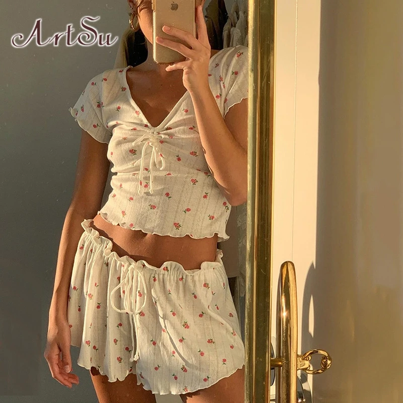 Комплект одежды ArtSu женский из 2 предметов, свободный топ и шорты в стиле бохо, эластичный облегающий элегантный пляжный костюм для отдыха, as28002, на лето, 2020