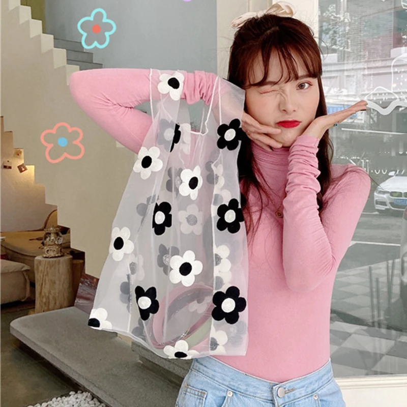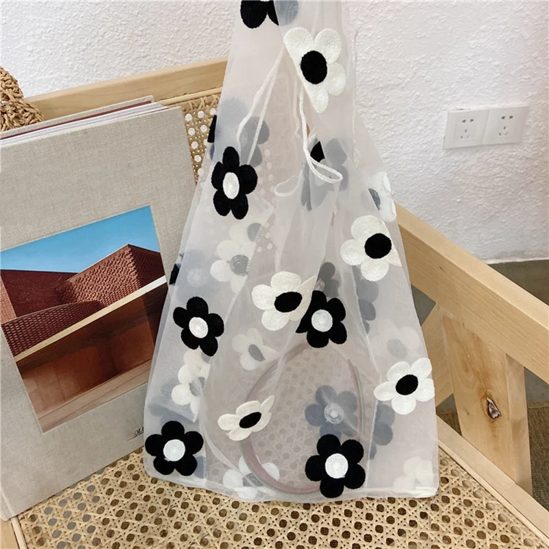 Женская прозрачная сумка-тоут с двойной тканью из органзы, Сумка с вышитыми цветами, Экологичная сумка для покупок, кошельки для девочек