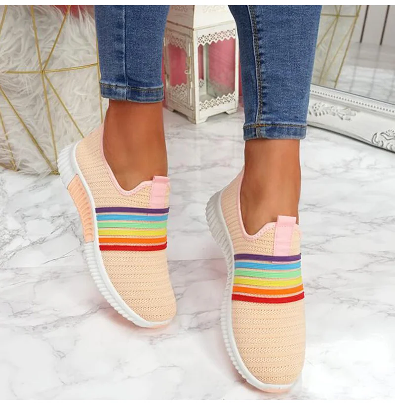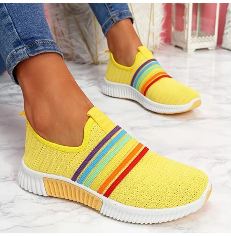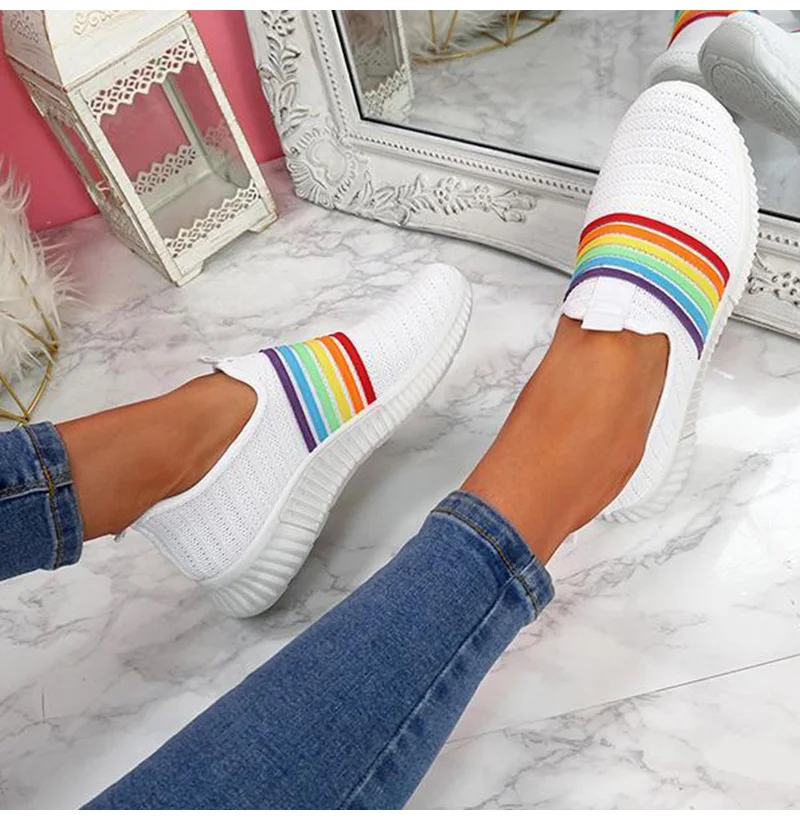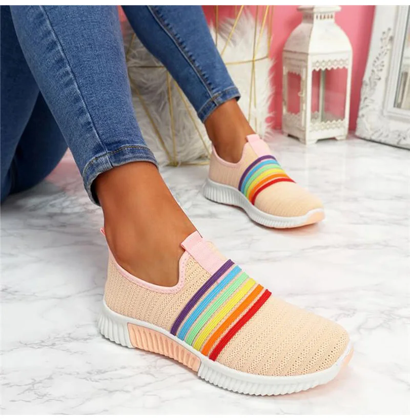 Женские кроссовки; Лоферы; Большие размеры; Женская обувь на плоской подошве; Цвет радуги; Легкая женская обувь из вулканизированной сетки; Удобная женская обувь для бега